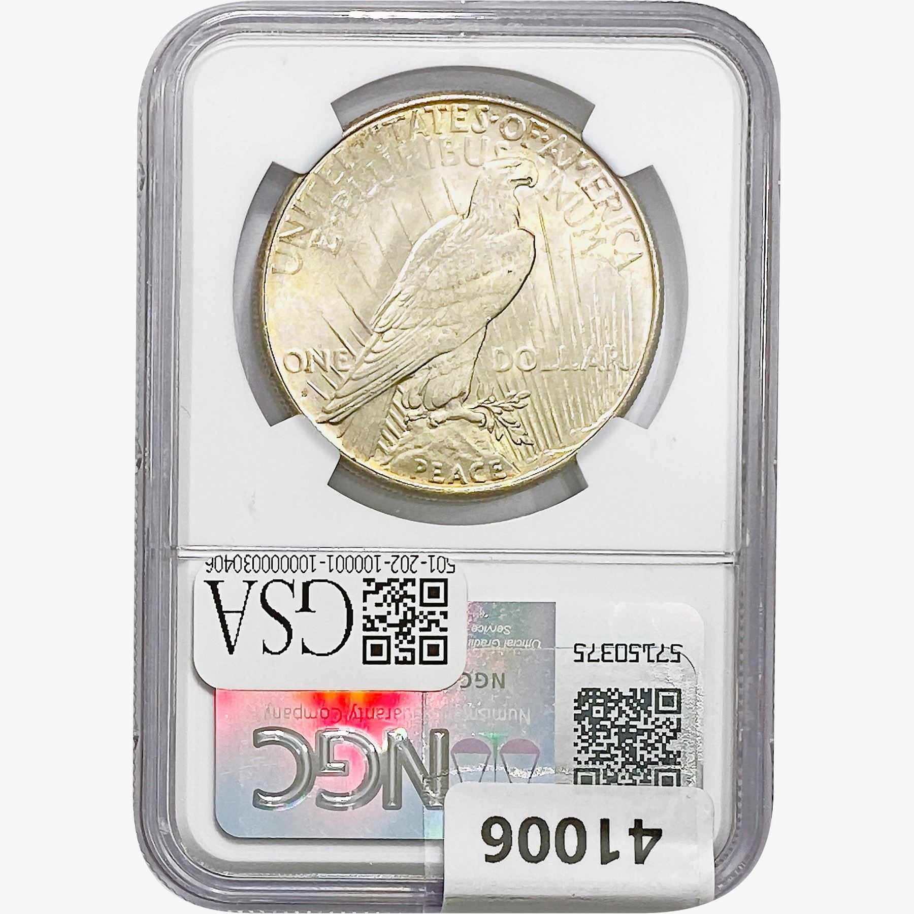 e. Coins sold referencing a third-party grading service are sold “AS IS” without any express or implied warranty, except for a guarantee by GSA that they are genuine. Removal or alteration of the holder, voids all of Bidder’s claims concerning that Product. Certain warranties may be available from the grading services and Bidders are referred to them for further details: Numismatic Guaranty Corporation (NGC), PO Box 4776, Sarasota, FL 34230, www.ngccoin.com/services/writtenguarantee.asp; Professional Coin Grading Services (PCGS), PO Box 9458, Newport Beach, CA 92658, www.pcgs.com/guarantee.html; ANACS, 6555 S. Kenton St., Ste. 303, Englewood, CO 80111; and Independent Coin Grading Co. (ICG), 7901 East Bellview, Ave., Suite 50, Englewood, CO 80111.