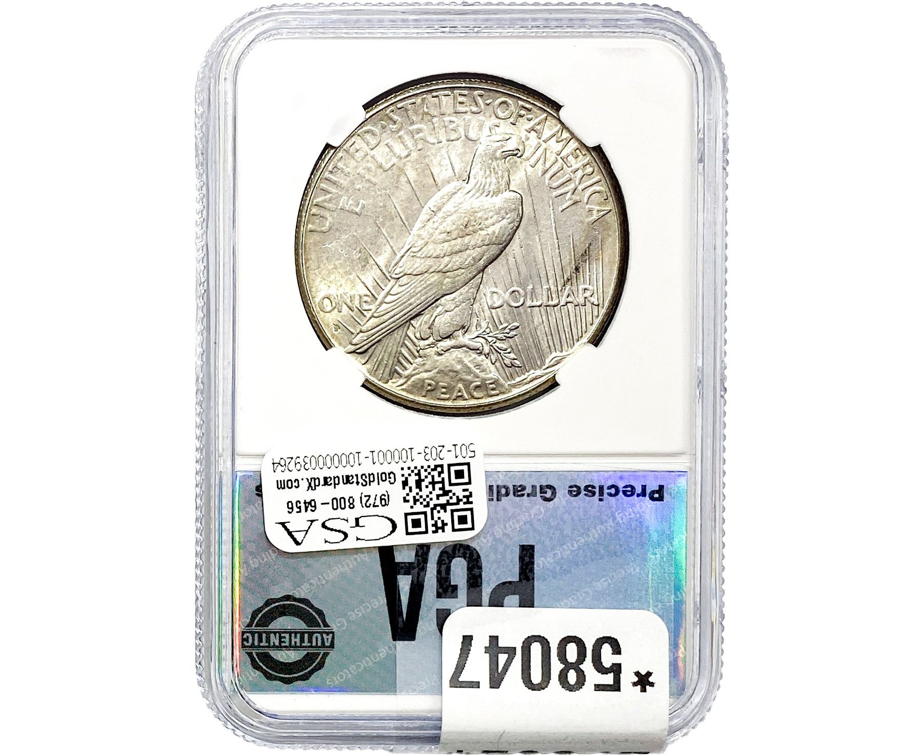 e. Coins sold referencing a third-party grading service are sold “AS IS” without any express or implied warranty, except for a guarantee by GSA that they are genuine. Removal or alteration of the holder, voids all of Bidder’s claims concerning that Product. Certain warranties may be available from the grading services and Bidders are referred to them for further details: Numismatic Guaranty Corporation (NGC), PO Box 4776, Sarasota, FL 34230, www.ngccoin.com/services/writtenguarantee.asp; Professional Coin Grading Services (PCGS), PO Box 9458, Newport Beach, CA 92658, www.pcgs.com/guarantee.html; ANACS, 6555 S. Kenton St., Ste. 303, Englewood, CO 80111; and Independent Coin Grading Co. (ICG), 7901 East Bellview, Ave., Suite 50, Englewood, CO 80111.