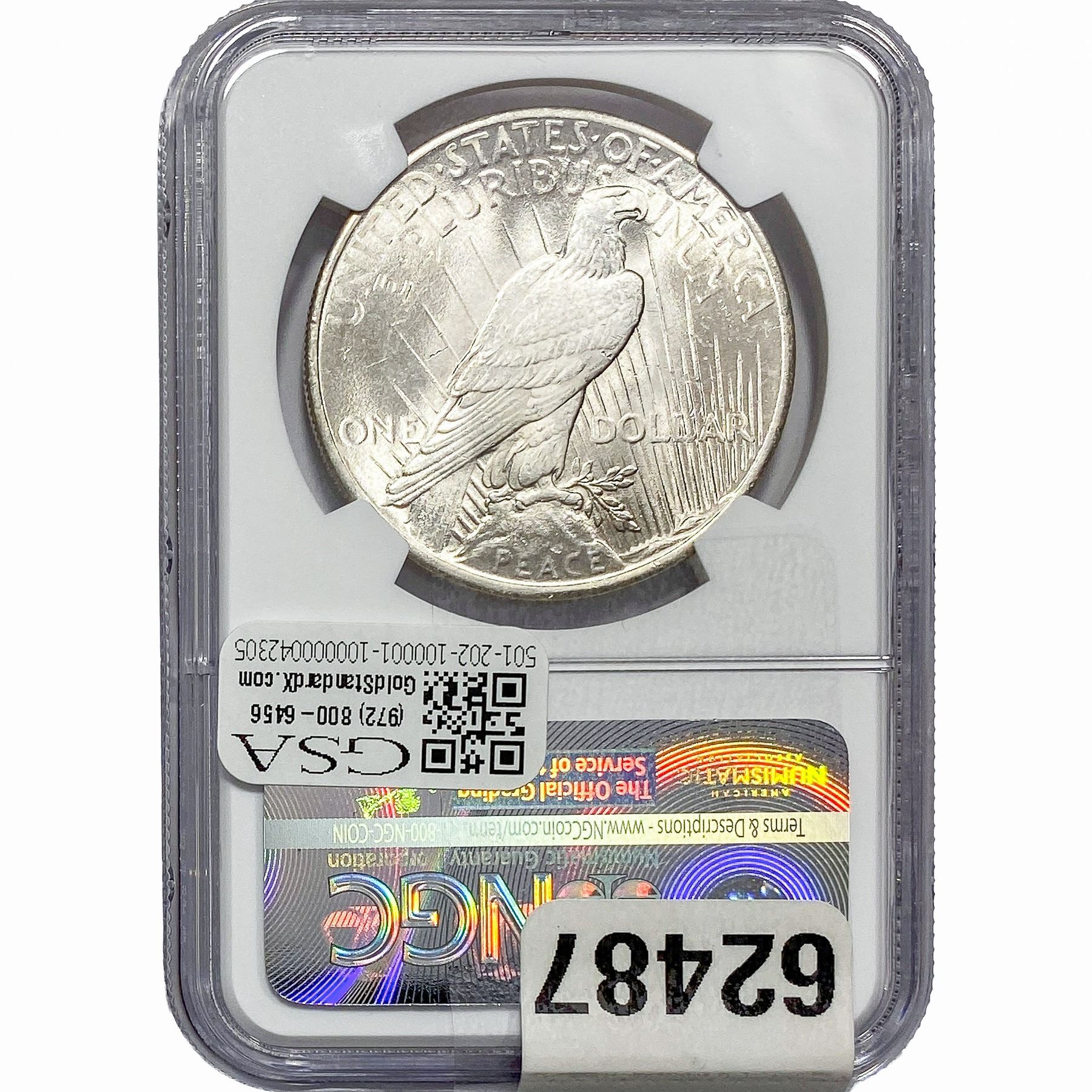 e. Coins sold referencing a third-party grading service are sold “AS IS” without any express or implied warranty, except for a guarantee by GSA that they are genuine. Removal or alteration of the holder, voids all of Bidder’s claims concerning that Product. Certain warranties may be available from the grading services and Bidders are referred to them for further details: Numismatic Guaranty Corporation (NGC), PO Box 4776, Sarasota, FL 34230, www.ngccoin.com/services/writtenguarantee.asp; Professional Coin Grading Services (PCGS), PO Box 9458, Newport Beach, CA 92658, www.pcgs.com/guarantee.html; ANACS, 6555 S. Kenton St., Ste. 303, Englewood, CO 80111; and Independent Coin Grading Co. (ICG), 7901 East Bellview, Ave., Suite 50, Englewood, CO 80111.