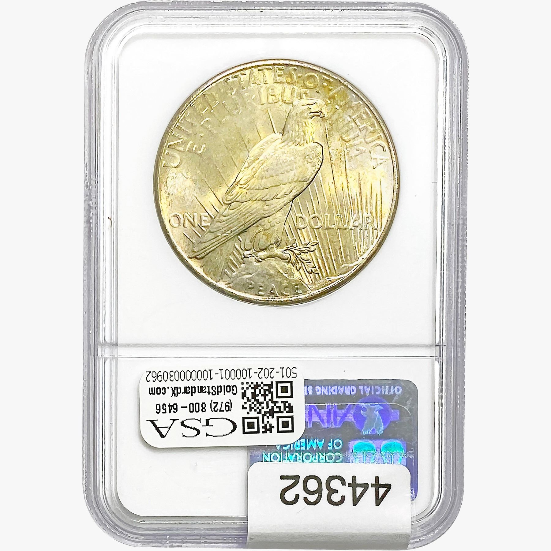 e. Coins sold referencing a third-party grading service are sold “AS IS” without any express or implied warranty, except for a guarantee by GSA that they are genuine. Removal or alteration of the holder, voids all of Bidder’s claims concerning that Product. Certain warranties may be available from the grading services and Bidders are referred to them for further details: Numismatic Guaranty Corporation (NGC), PO Box 4776, Sarasota, FL 34230, www.ngccoin.com/services/writtenguarantee.asp; Professional Coin Grading Services (PCGS), PO Box 9458, Newport Beach, CA 92658, www.pcgs.com/guarantee.html; ANACS, 6555 S. Kenton St., Ste. 303, Englewood, CO 80111; and Independent Coin Grading Co. (ICG), 7901 East Bellview, Ave., Suite 50, Englewood, CO 80111.