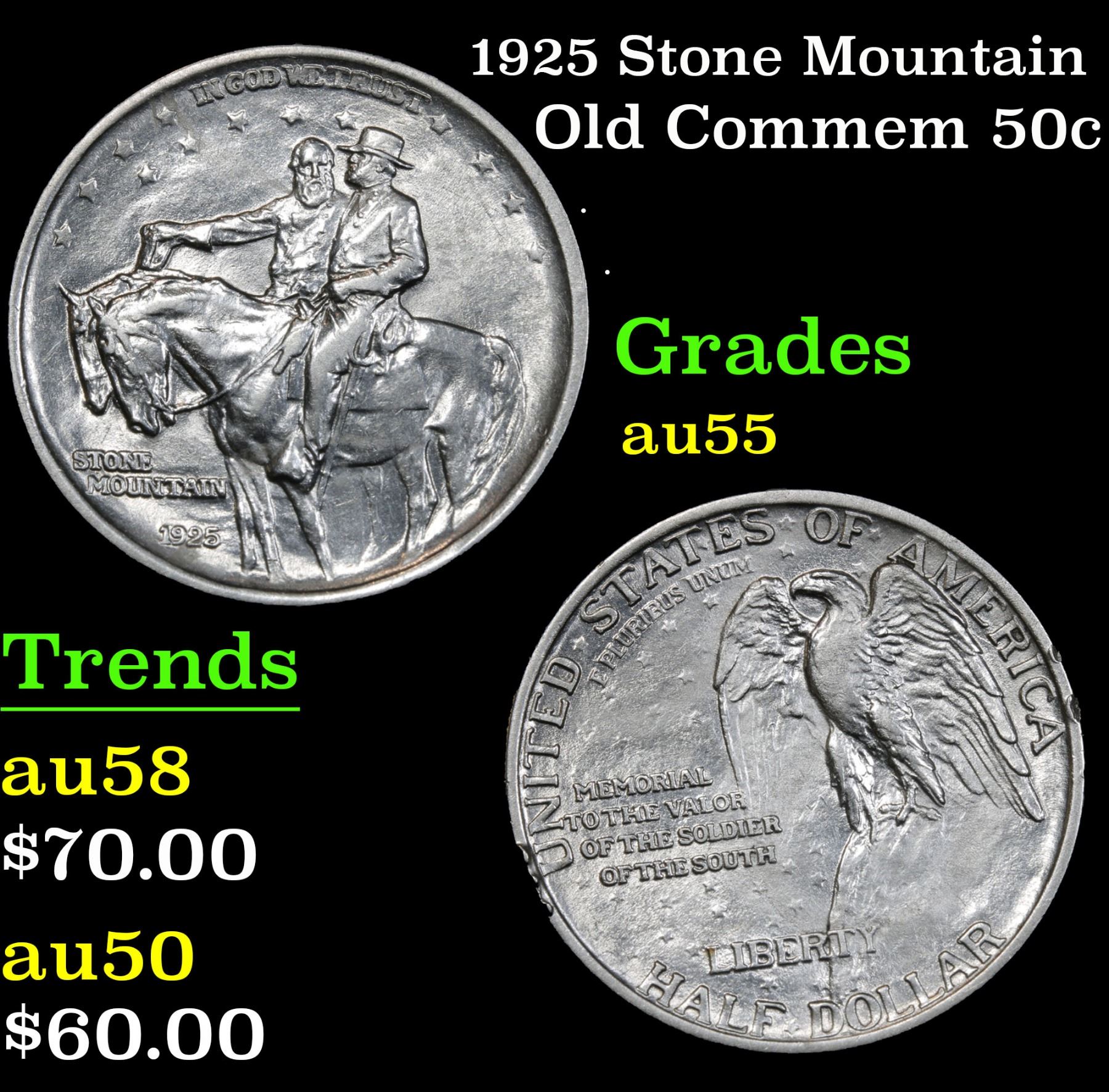 1925 Stone Mountain . . Old Commem Half Dollar 50c Grades Choice AU. One of the most Beloved Commemoratives. A perennial favorite and one of the most popular commemoratives - the Stone Mountain never dissapoints in its desirability. It celebrates the construction of a monument carved into The Stone Mountain outside of Atlanta, except the Monument was not completed till 1970 some 45 years after is minting. The original designer of the monument was discharged after a falling out and went on to create Mount Rushmore. When Examining a Stone Mountain Commemorative examine General LeeÕs elbow and the eagleÕs breast for the first signs of wear.