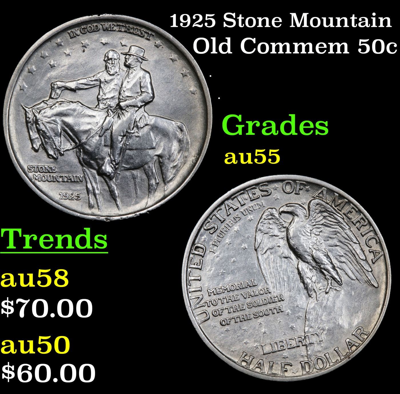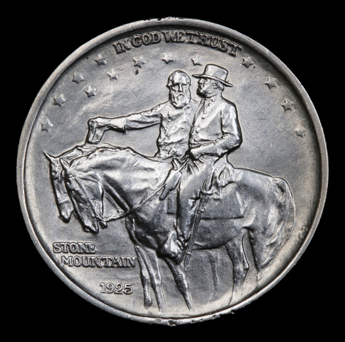 1925 Stone Mountain Old Commem Half Dollar 50c Grades Choice AU. One of the most Beloved Commemoratives. A perennial favorite and one of the most popular commemoratives - the Stone Mountain never dissapoints in its desirability. It celebrates the construction of a monument carved into The Stone Mountain outside of Atlanta, except the Monument was not completed till 1970 some 45 years after is minting. The original designer of the monument was discharged after a falling out and went on to create Mount Rushmore. When Examining a Stone Mountain Commemorative examine General Lee’s elbow and the eagle’s breast for the first signs of wear.