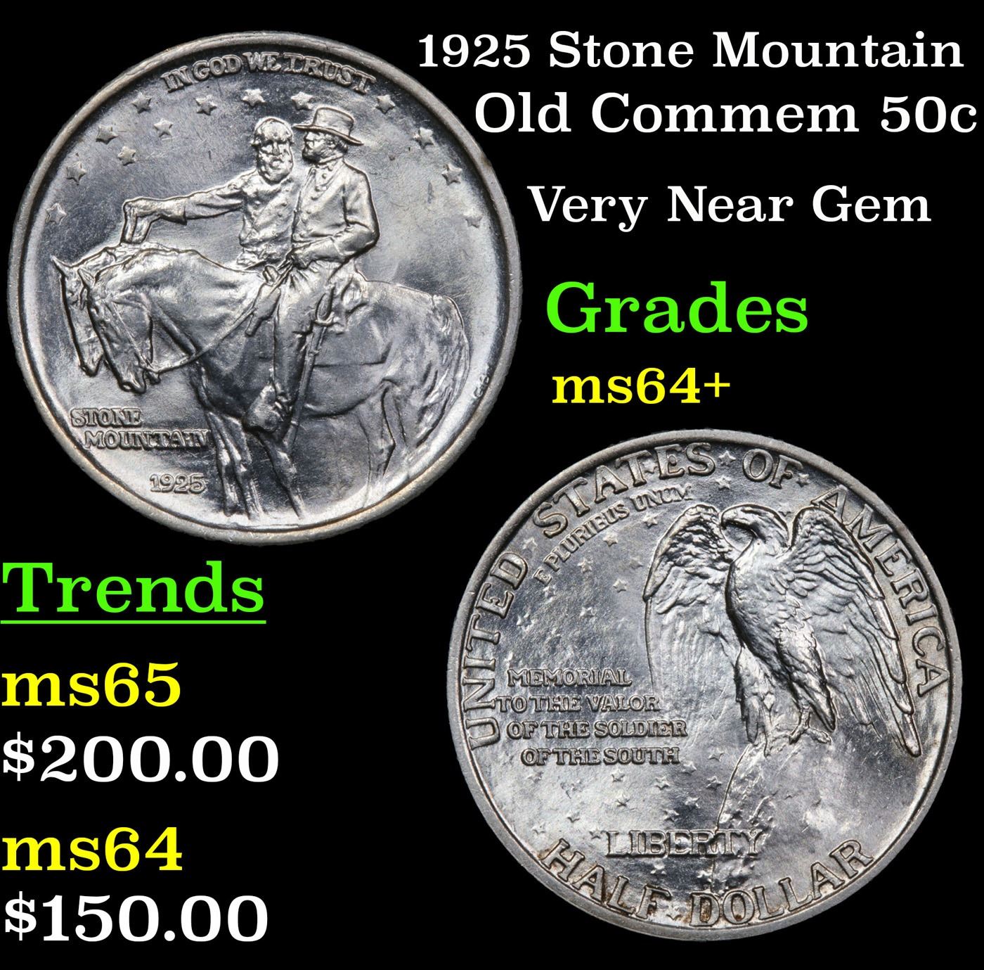 1925 Stone Mountain Old Commem Half Dollar 50c Grades Choice+ Unc. One of the most Beloved Commemoratives. A perennial favorite and one of the most popular commemoratives - the Stone Mountain never dissapoints in its desirability. It celebrates the construction of a monument carved into The Stone Mountain outside of Atlanta, except the Monument was not completed till 1970 some 45 years after is minting. The original designer of the monument was discharged after a falling out and went on to create Mount Rushmore. When Examining a Stone Mountain Commemorative examine General Lee’s elbow and the eagle’s breast for the first signs of wear.