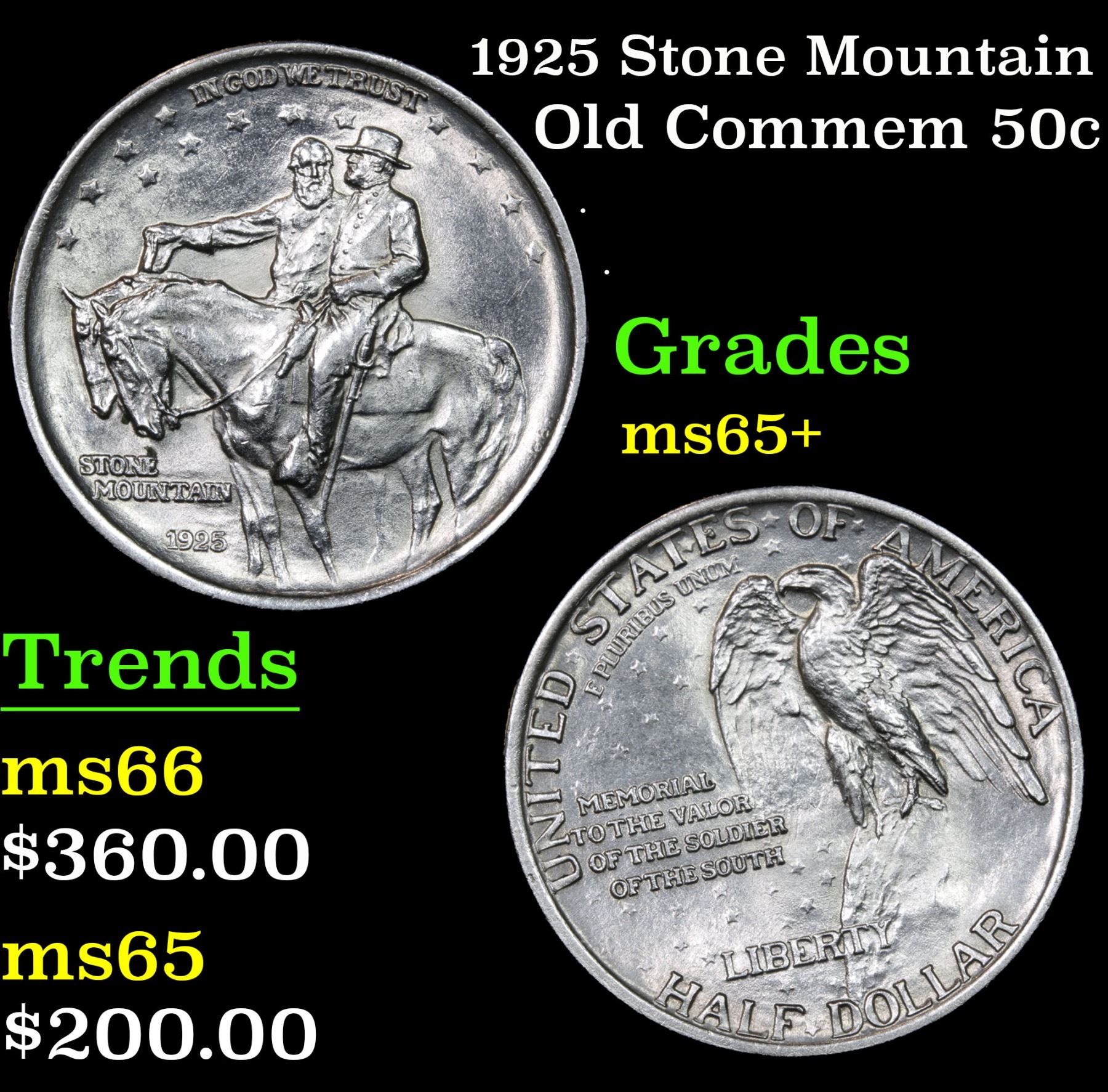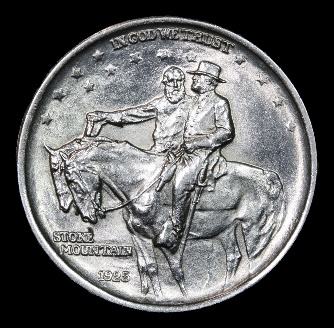1925 Stone Mountain Old Commem Half Dollar 50c Grades GEM+ Unc. One of the most Beloved Commemoratives. A perennial favorite and one of the most popular commemoratives - the Stone Mountain never dissapoints in its desirability. It celebrates the construction of a monument carved into The Stone Mountain outside of Atlanta, except the Monument was not completed till 1970 some 45 years after is minting. The original designer of the monument was discharged after a falling out and went on to create Mount Rushmore. When Examining a Stone Mountain Commemorative examine General LeeÕs elbow and the eagleÕs breast for the first signs of wear. A Corey's Pick, Bid to Win, Don't let it get Away Coin