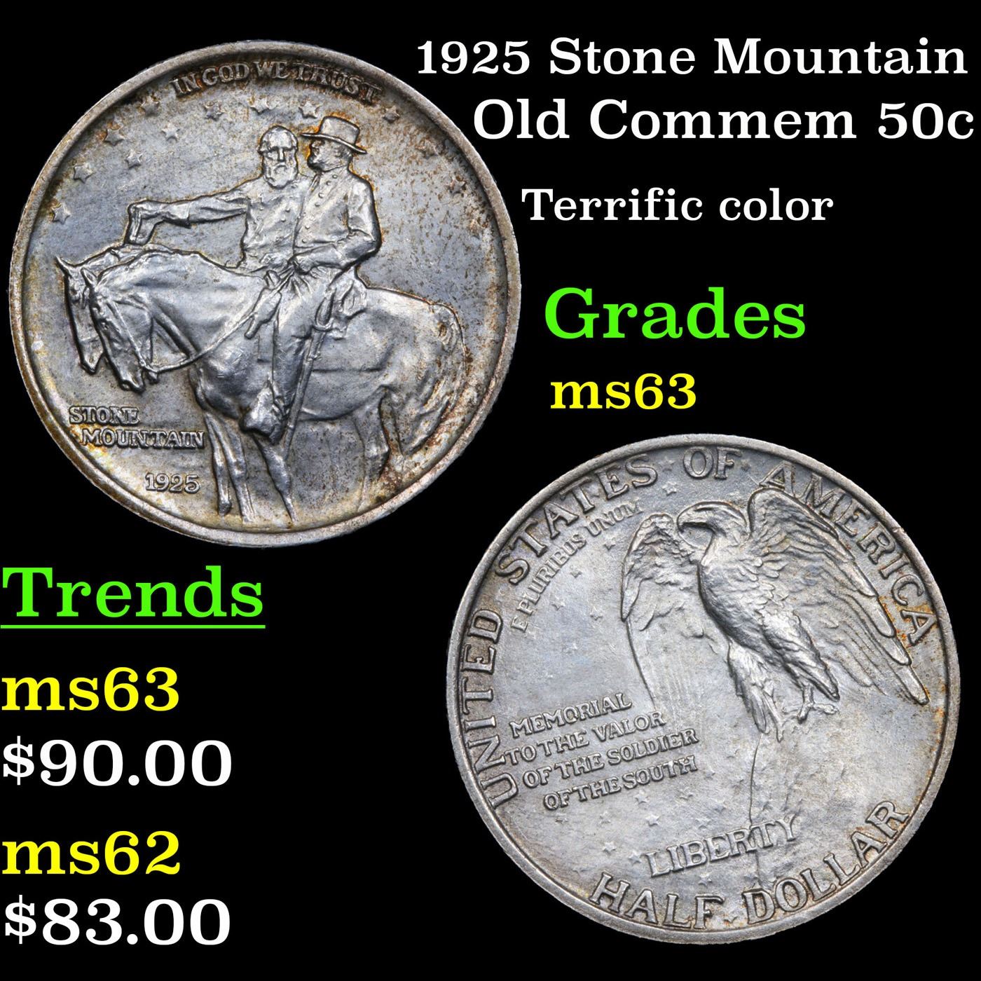 1925 Stone Mountain Old Commem Half Dollar 50c Grades Select Unc. One of the most Beloved Commemoratives. A perennial favorite and one of the most popular commemoratives - the Stone Mountain never dissapoints in its desirability. It celebrates the construction of a monument carved into The Stone Mountain outside of Atlanta, except the Monument was not completed till 1970 some 45 years after is minting. The original designer of the monument was discharged after a falling out and went on to create Mount Rushmore. When Examining a Stone Mountain Commemorative examine General Lee’s elbow and the eagle’s breast for the first signs of wear.