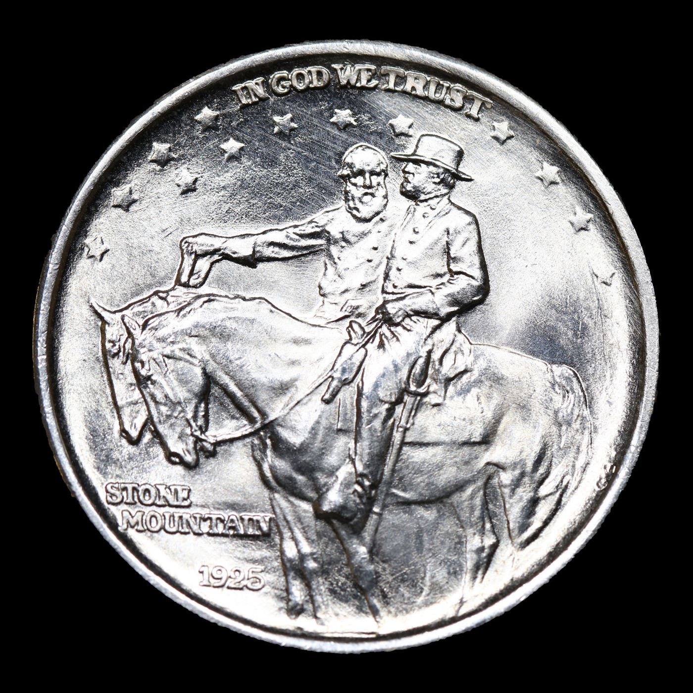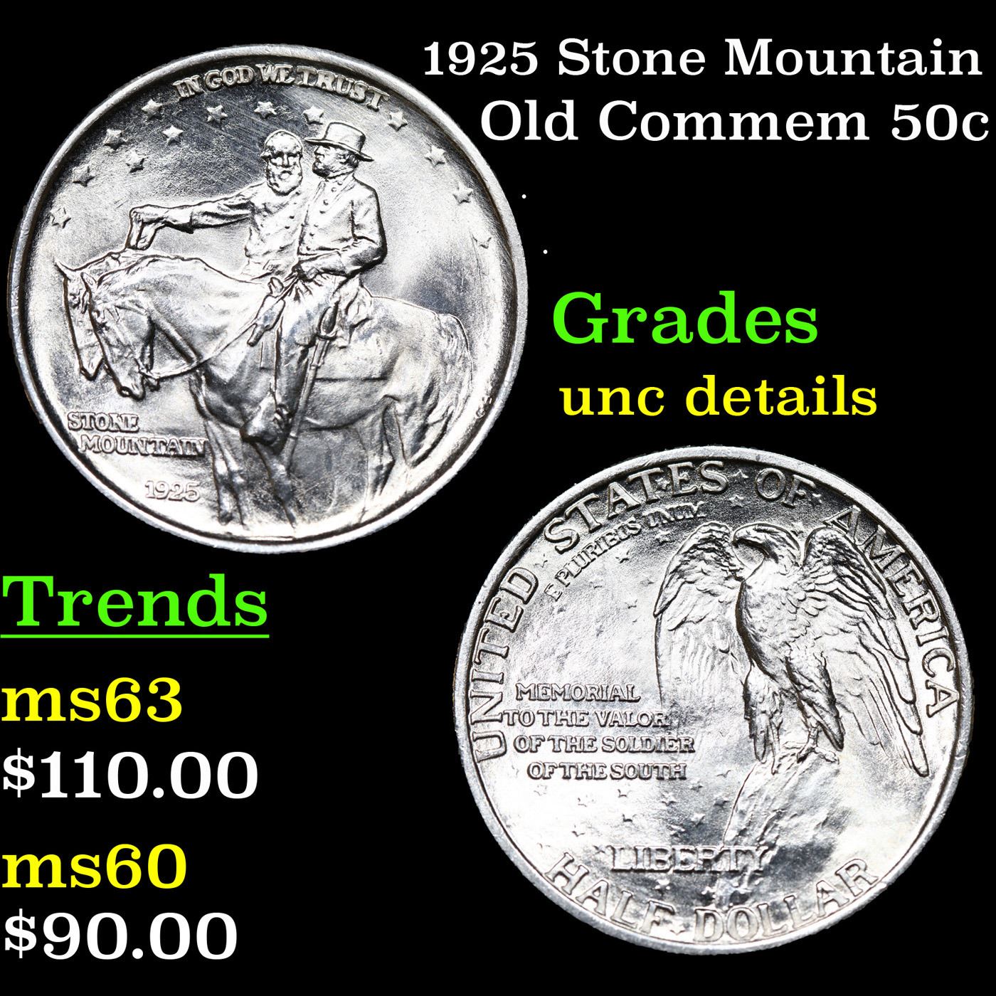 1925 Stone Mountain Old Commem Half Dollar 50c Grades Unc Details. One of the most Beloved Commemoratives. A perennial favorite and one of the most popular commemoratives - the Stone Mountain never dissapoints in its desirability. It celebrates the construction of a monument carved into The Stone Mountain outside of Atlanta, except the Monument was not completed till 1970 some 45 years after is minting. The original designer of the monument was discharged after a falling out and went on to create Mount Rushmore. When Examining a Stone Mountain Commemorative examine General Lee’s elbow and the eagle’s breast for the first signs of wear.