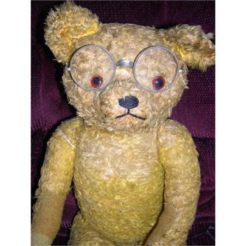 1925 Straw Stuffed 23" Hump Bear. Bear has vintage glasses. Believe bear to be original , not cleaned some worn spots fully jointed with glass eyes. I will leave the cleaning to someone who know how to do it. He appears to be a nice golden yellow color. Cute expression. Bear comes from a smoke free environment. Buyer to pay $20 for shipping, handling, and insurance. Thanks for viewing.