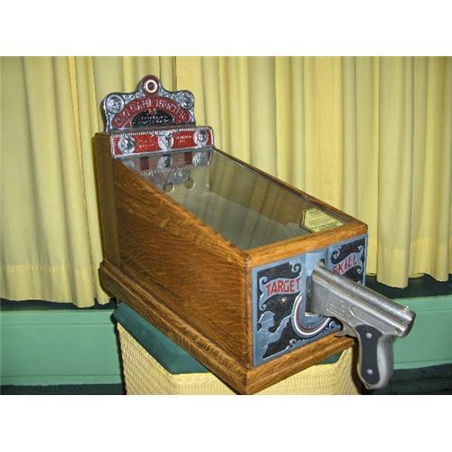 Here is a wonderful Coin Operated Big Game Hunter Penny Arcade for your viewing pleasure. It is a Target Skill Game. You get 5 shots for a penny. It is all Original and is in beautiful condition. There are a few minor scratches on the back, but nothing to detract from the beauty of this machine. It was Patented by W.A.Tratsch on September 1, 1925. The maker was A.B.T MFG. Co. in Chicago, ILL. The Makers #25318 is embossed in the oak at the base of the glass on the top. The Patent No.1551858 is located on the left side of the pistol. The game is in Excellent Working Order. It has been well loved, and residing in my home for over 25 years. The game also comes with 2 Keys. The metal decoration on the front and top are aluninum and the paint is in excellent condition. The under base and working parts are steel. The label on the top glass is also in excellent condition. I think the photos show this to be true. The label inside the back has instructions on the operation of the game. It has always been a show piece in our home, I hope the new owner enjoys it as much as my family has through the years. Thank you for viewing. Have a look at my other items.