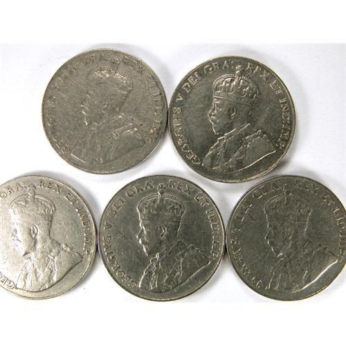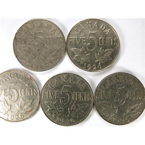 Canada Five Cents 1925, VG with digs and rim nicks. Plus 1926 Near 6 four pieces, VF-EF with scratches, F-VF and two Fine. Total five pieces