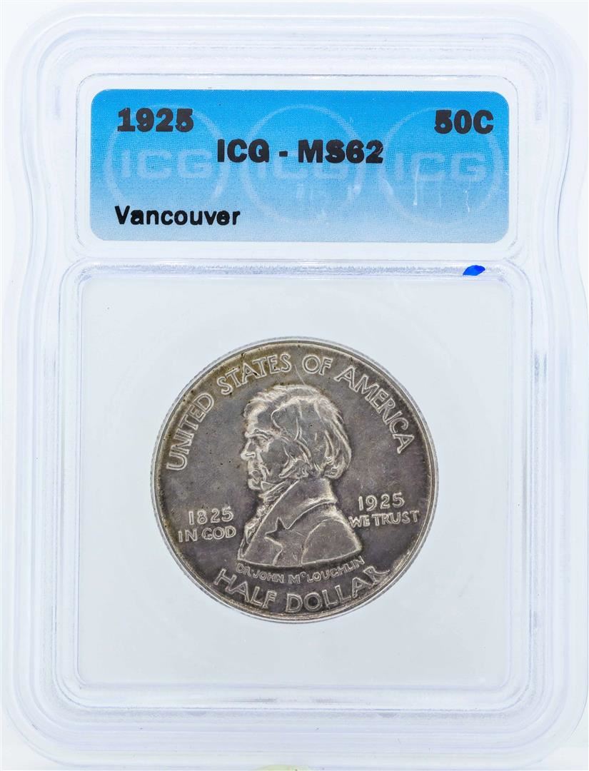 One 1925 Vancouver Commemorative Half Dollar Coin ICG MS62. ICG Certified.