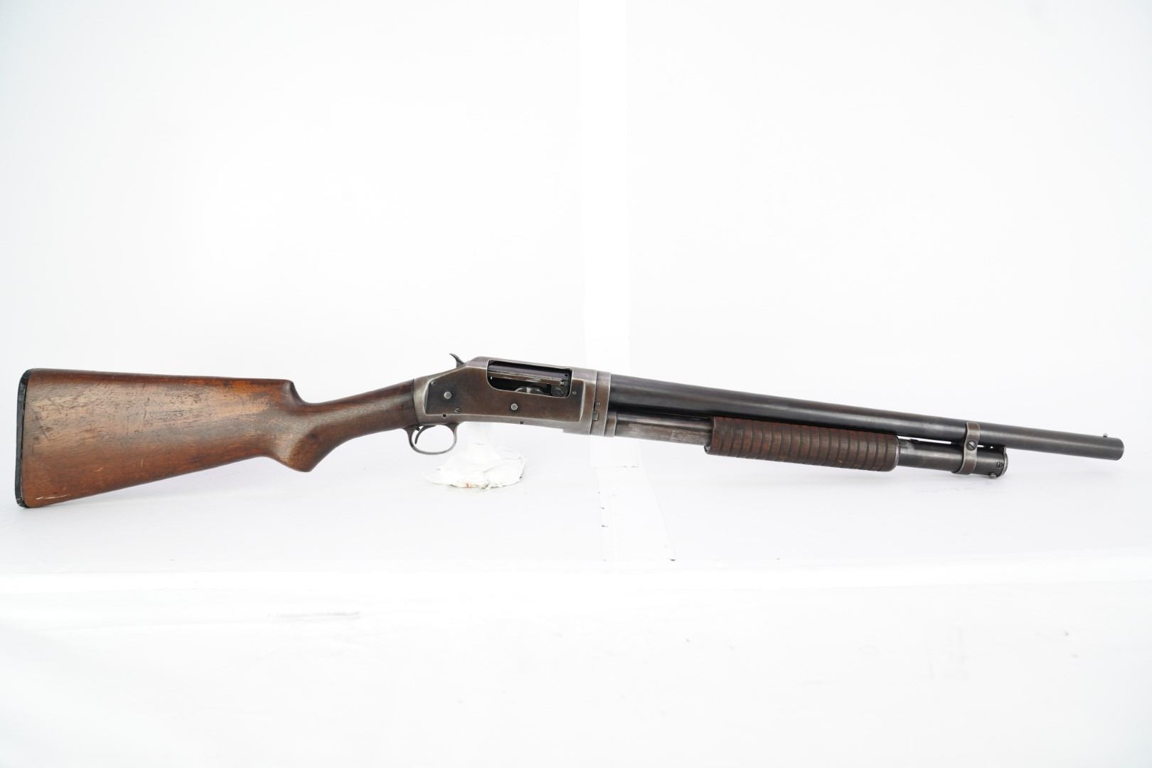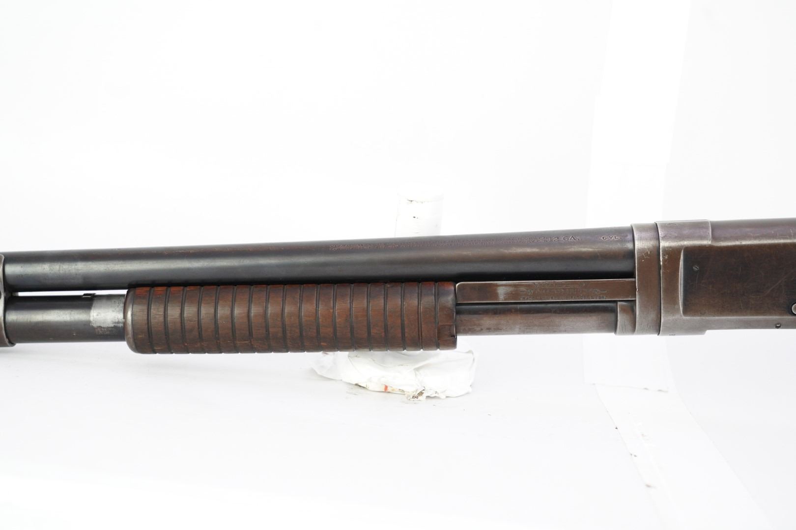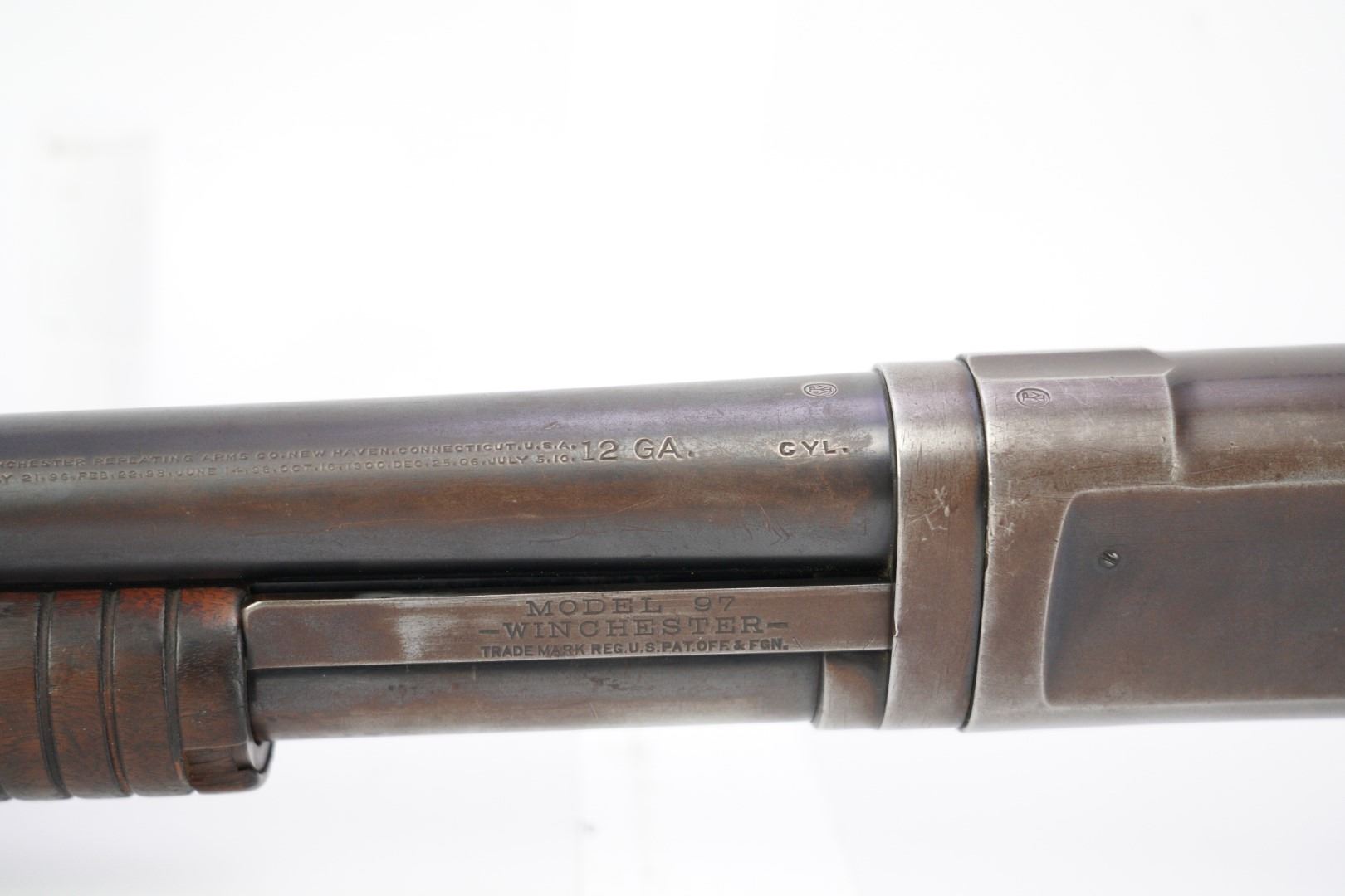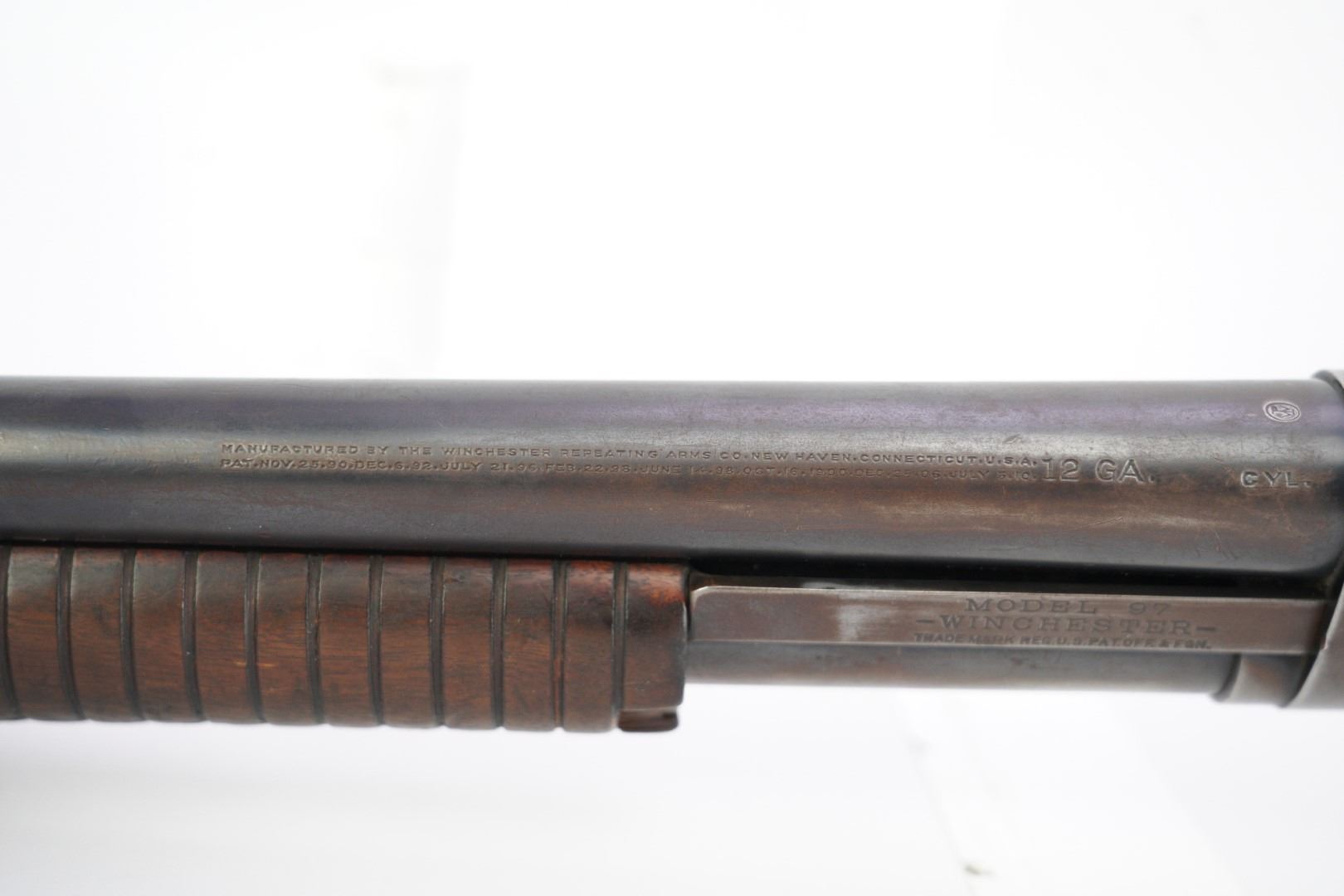 Our Assessment: The Winchester 1897 has served millions of Americans as the go-to shotgun for the home, trench, field or cowboy shooting gun cart. It is one of the most produced American shotguns, and for good reason. The action is strong and reliable, designed by John Moses Browning, it takes down easily, yet functions simply and indefinitely. During the first 12 years of production, Winchester made 37 major and 52 minor changes to the Model 1897 culminating in the "e" guns (as this one is) and a prize in any Winchester collection.This gun has survived the years, almost 100 of them now, without being chopped or abused. It is an honest and well used shotgun that has been cared for. The bore is bright and the action is still tight for you to take this home and make it your new go-to. We would even turn the other direction if you wanted to make it your SASS gun. Please see our photos and good luck in your bidding!