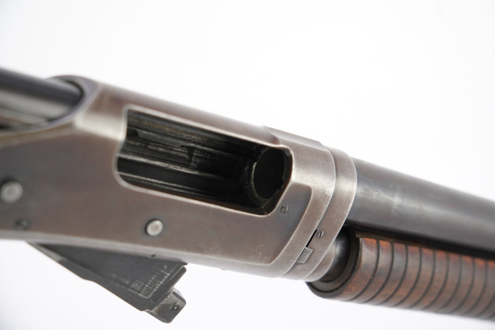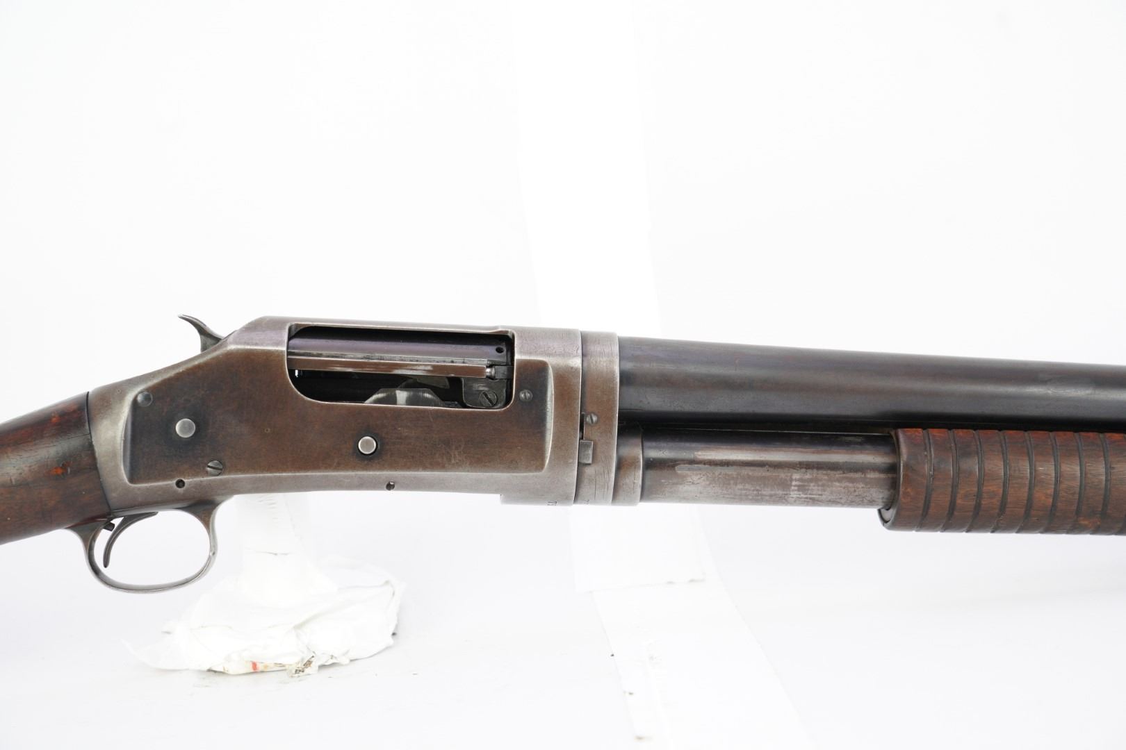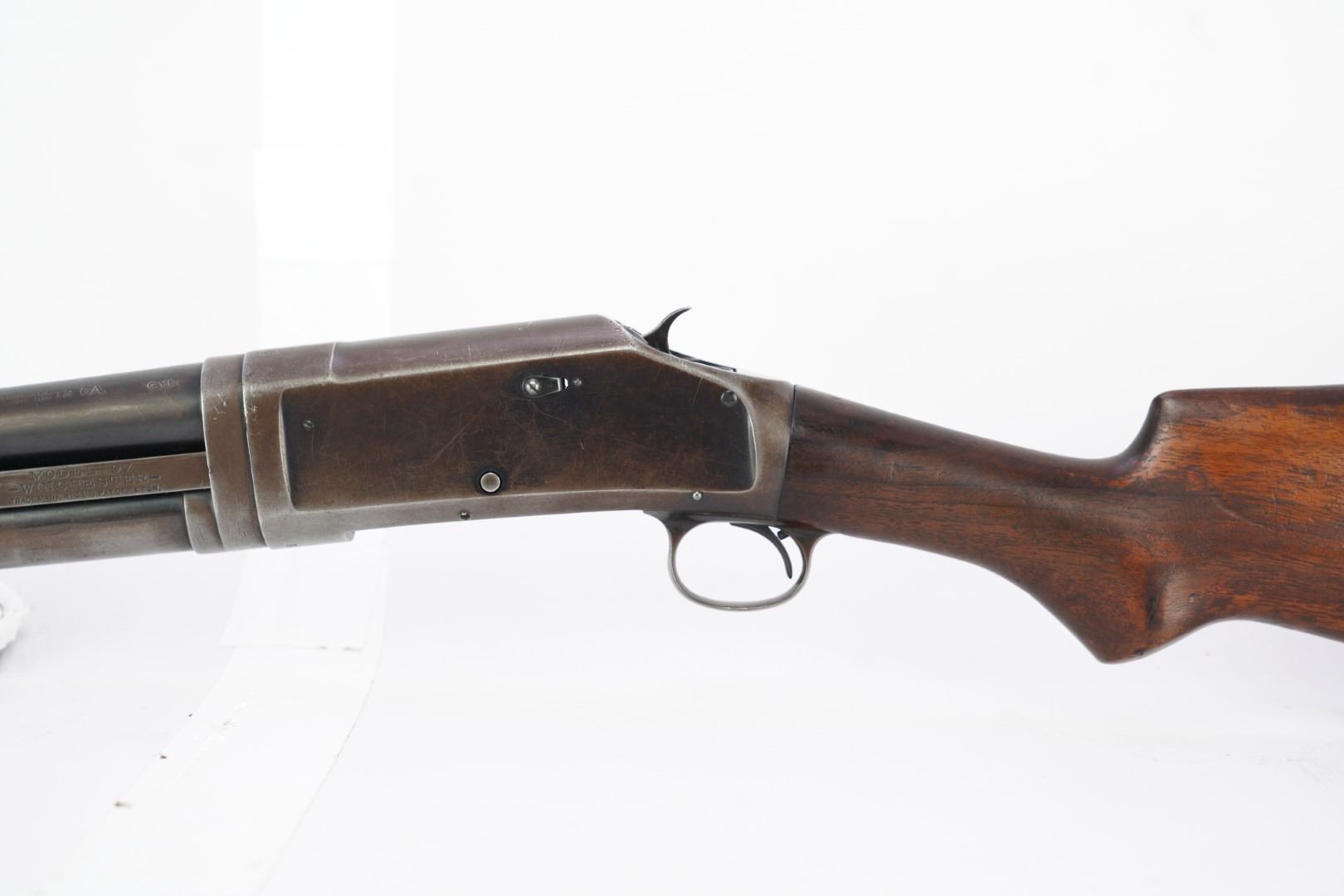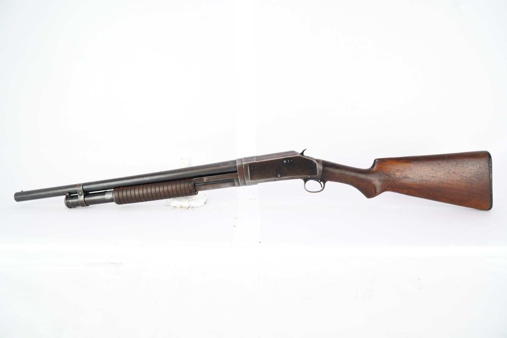 Our Assessment: The Winchester 1897 has served millions of Americans as the go-to shotgun for the home, trench, field or cowboy shooting gun cart. It is one of the most produced American shotguns, and for good reason. The action is strong and reliable, designed by John Moses Browning, it takes down easily, yet functions simply and indefinitely. During the first 12 years of production, Winchester made 37 major and 52 minor changes to the Model 1897 culminating in the "e" guns (as this one is) and a prize in any Winchester collection.This gun has survived the years, almost 100 of them now, without being chopped or abused. It is an honest and well used shotgun that has been cared for. The bore is bright and the action is still tight for you to take this home and make it your new go-to. We would even turn the other direction if you wanted to make it your SASS gun. Please see our photos and good luck in your bidding!
