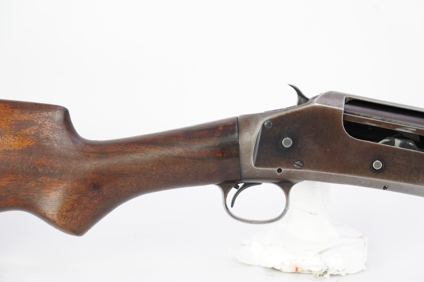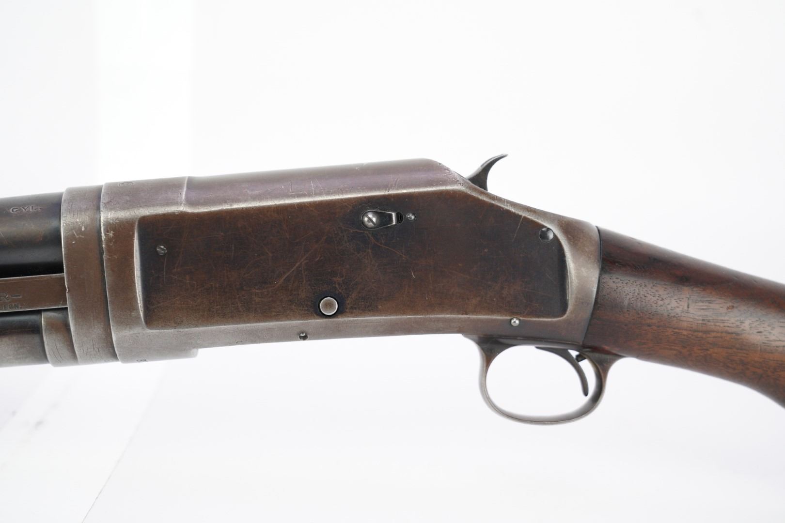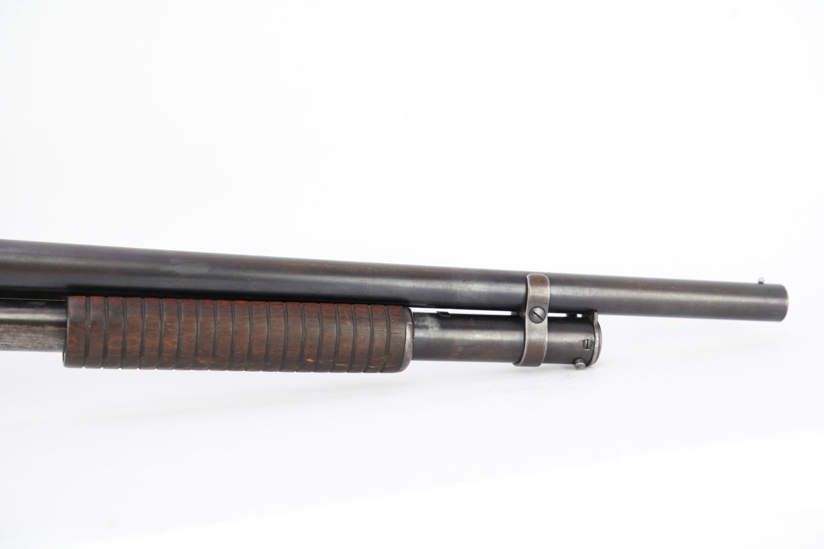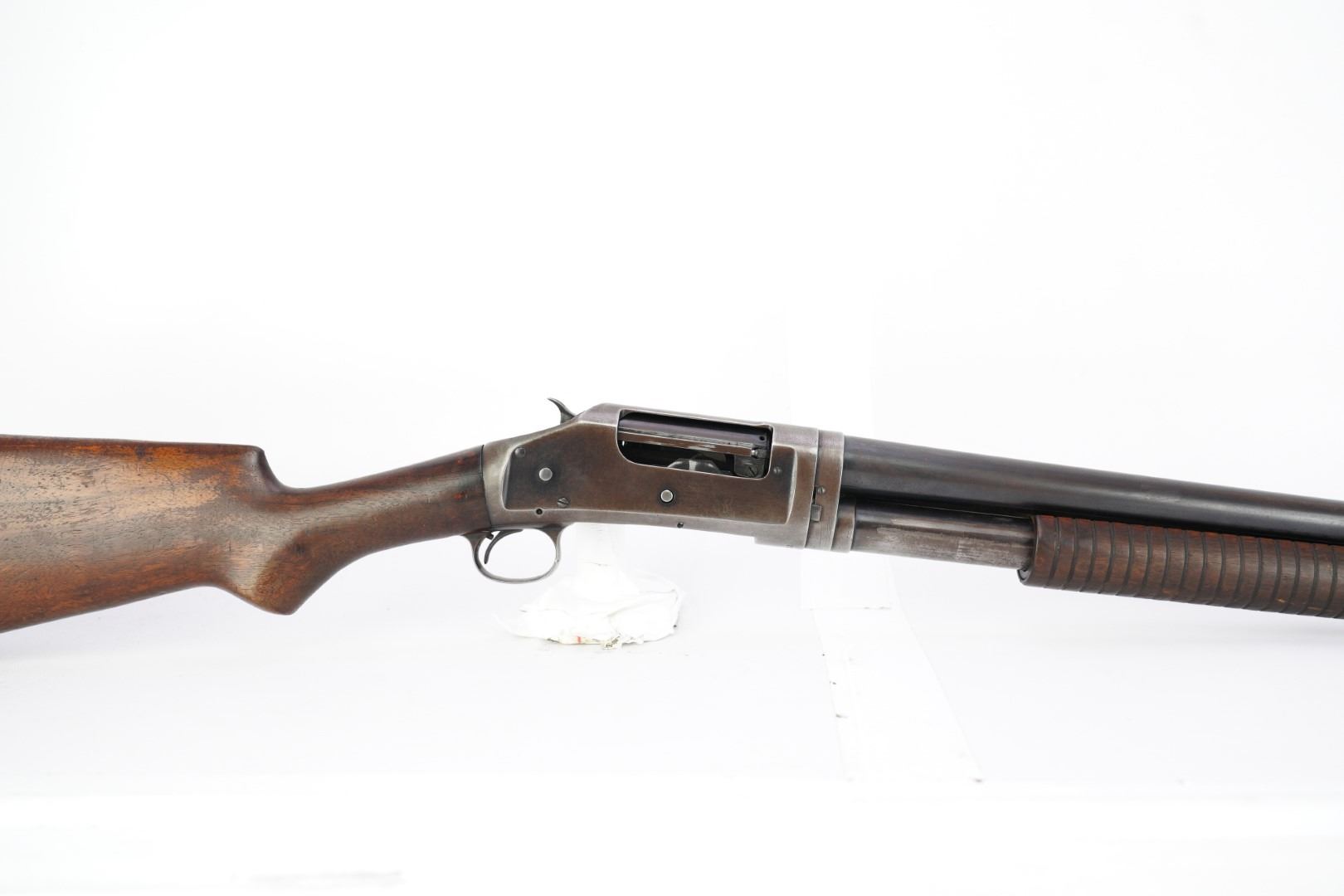 Our Assessment: The Winchester 1897 has served millions of Americans as the go-to shotgun for the home, trench, field or cowboy shooting gun cart. It is one of the most produced American shotguns, and for good reason. The action is strong and reliable, designed by John Moses Browning, it takes down easily, yet functions simply and indefinitely. During the first 12 years of production, Winchester made 37 major and 52 minor changes to the Model 1897 culminating in the "e" guns (as this one is) and a prize in any Winchester collection.This gun has survived the years, almost 100 of them now, without being chopped or abused. It is an honest and well used shotgun that has been cared for. The bore is bright and the action is still tight for you to take this home and make it your new go-to. We would even turn the other direction if you wanted to make it your SASS gun. Please see our photos and good luck in your bidding!