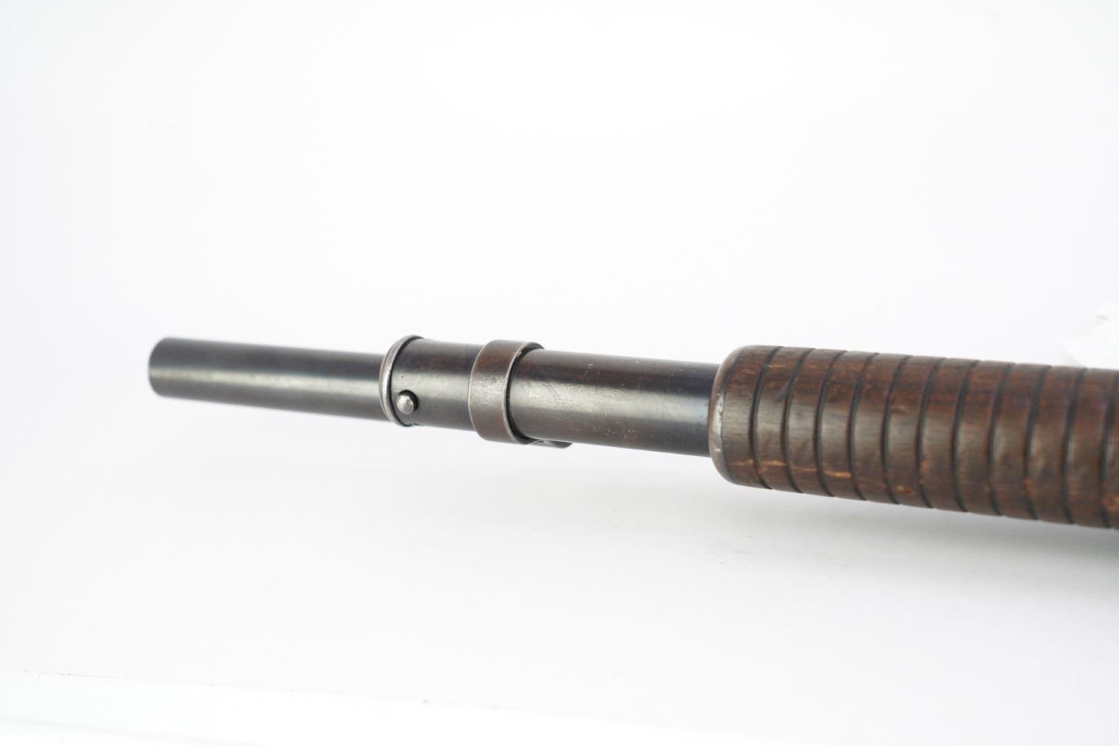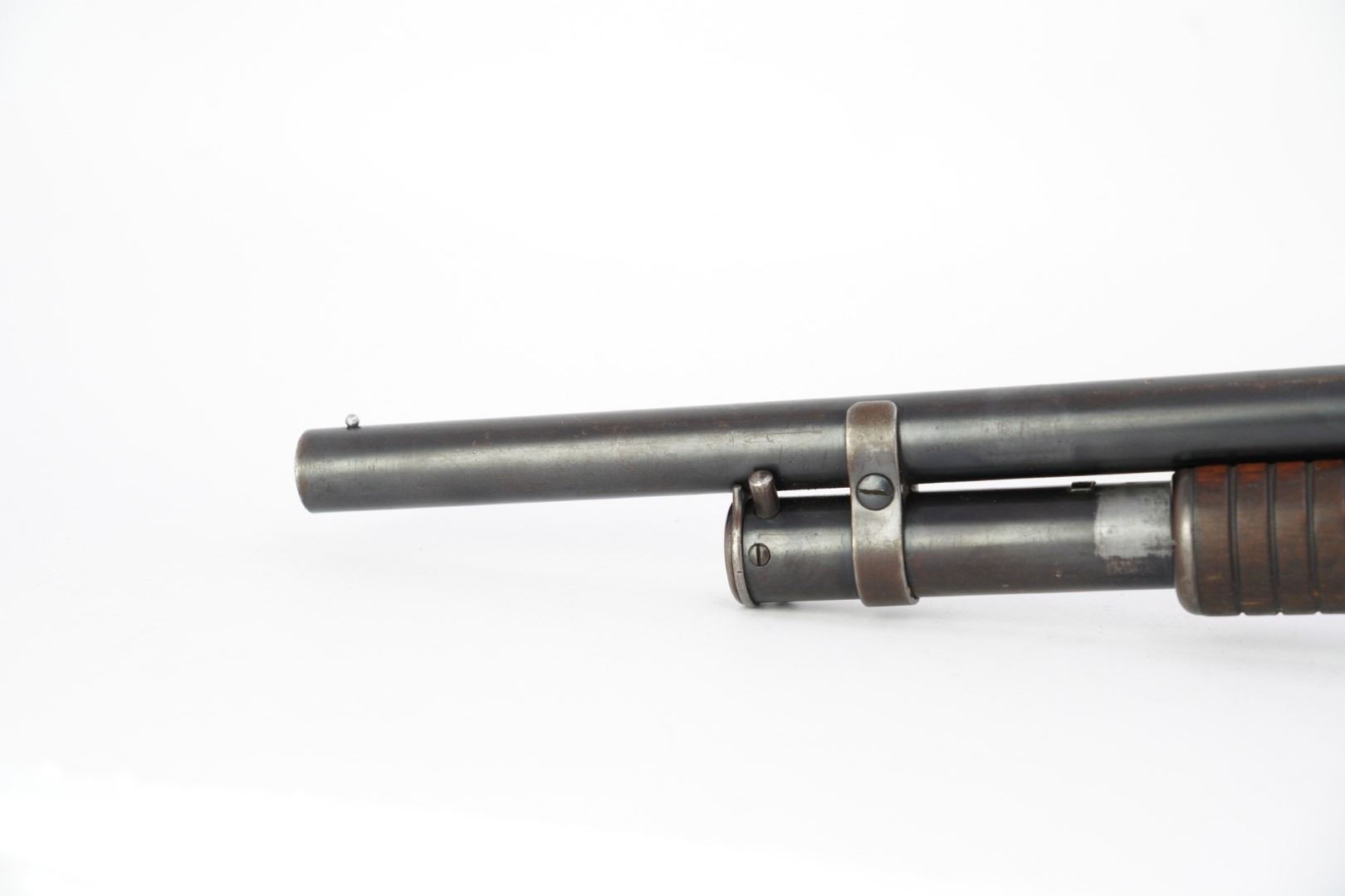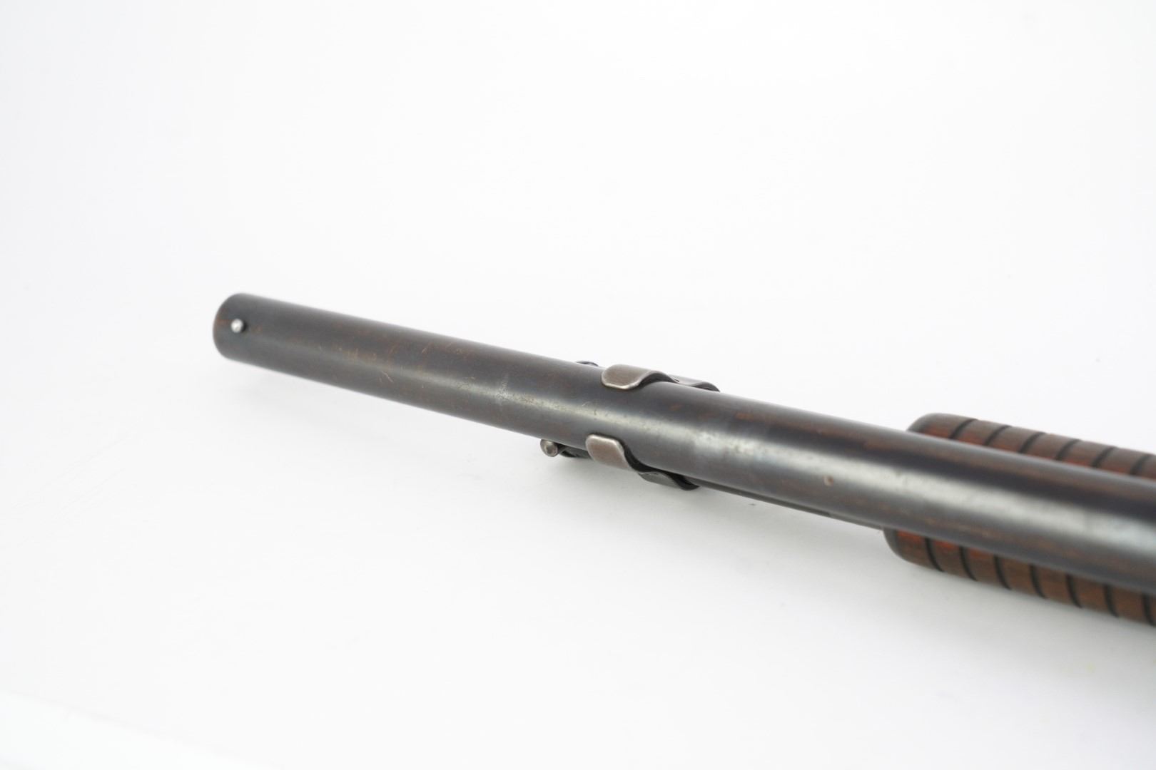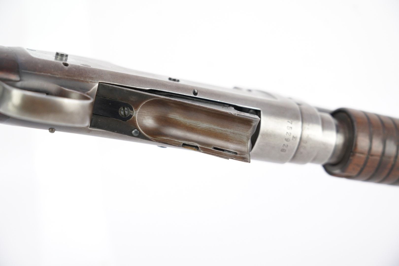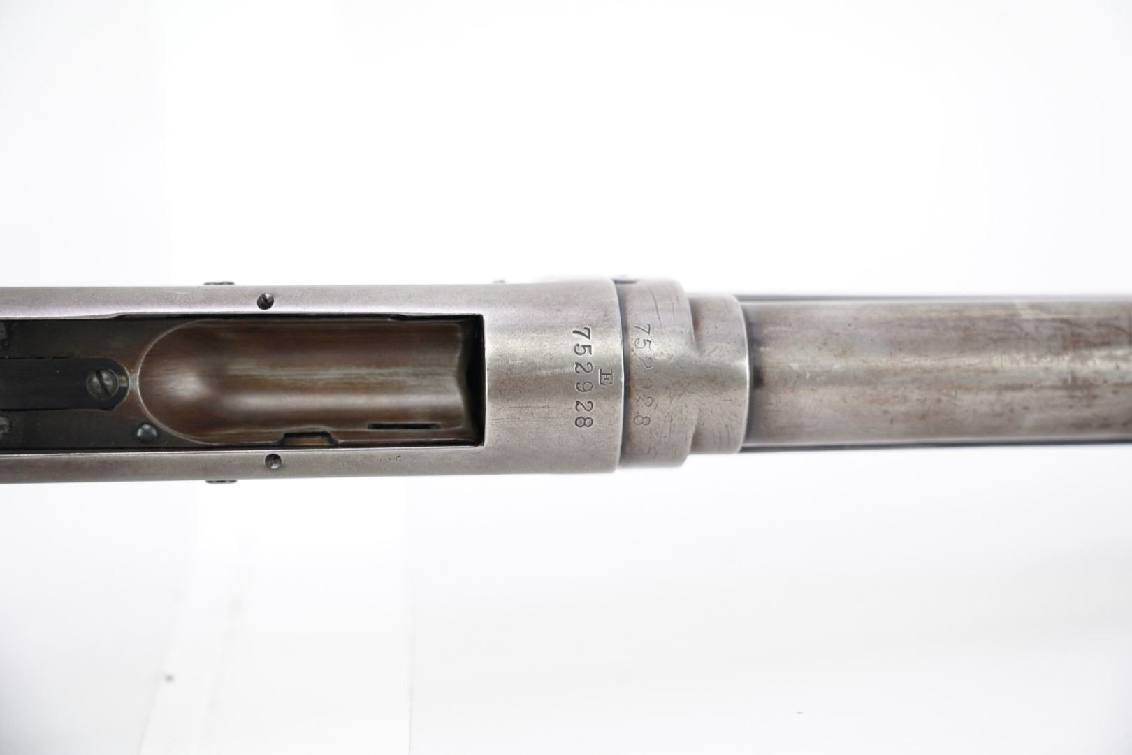 Overall Condition: This shotgun retains about 80% of its metal finish. The balance of the finish shows part of the barrel and the majority of the receiver have gone to a brownish patina. There is moderate operational wear on the magazine tube. There are scattered nicks, dings, scratches and handling marks throughout. There is thinning and contact wear at some of the leading edges. The screw heads are well-defined. The markings are clear. Overall, this shotgun is in Very Good condition.