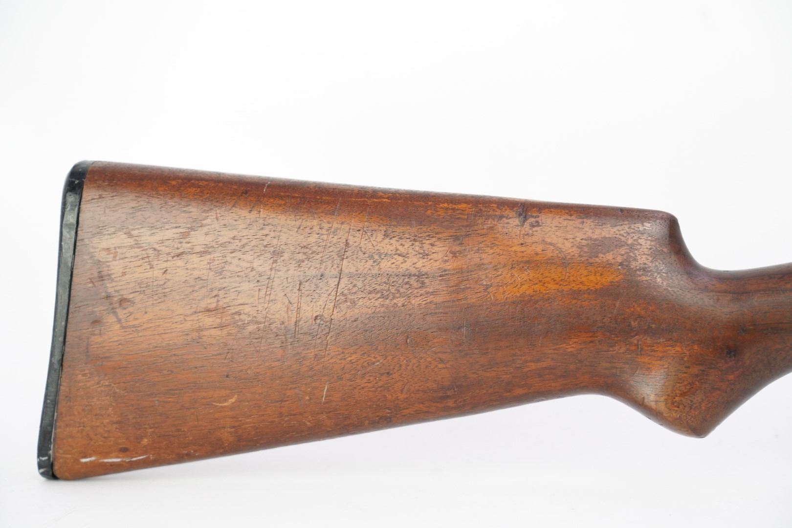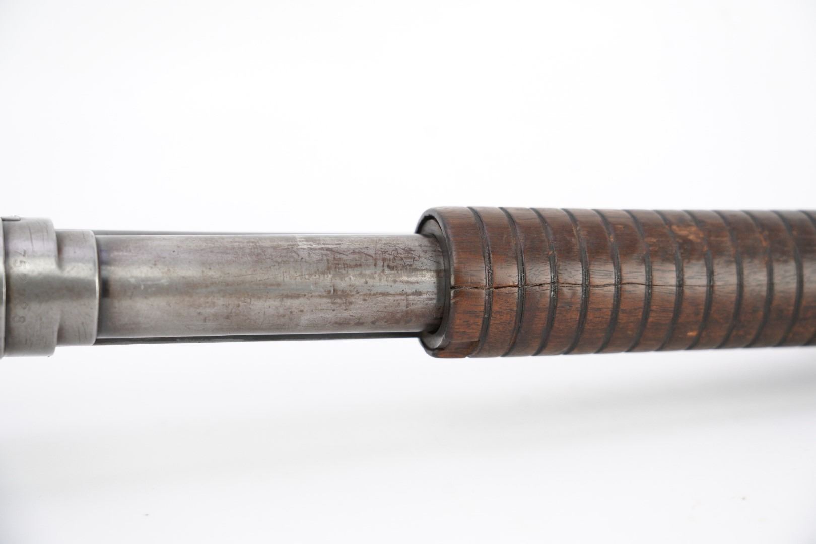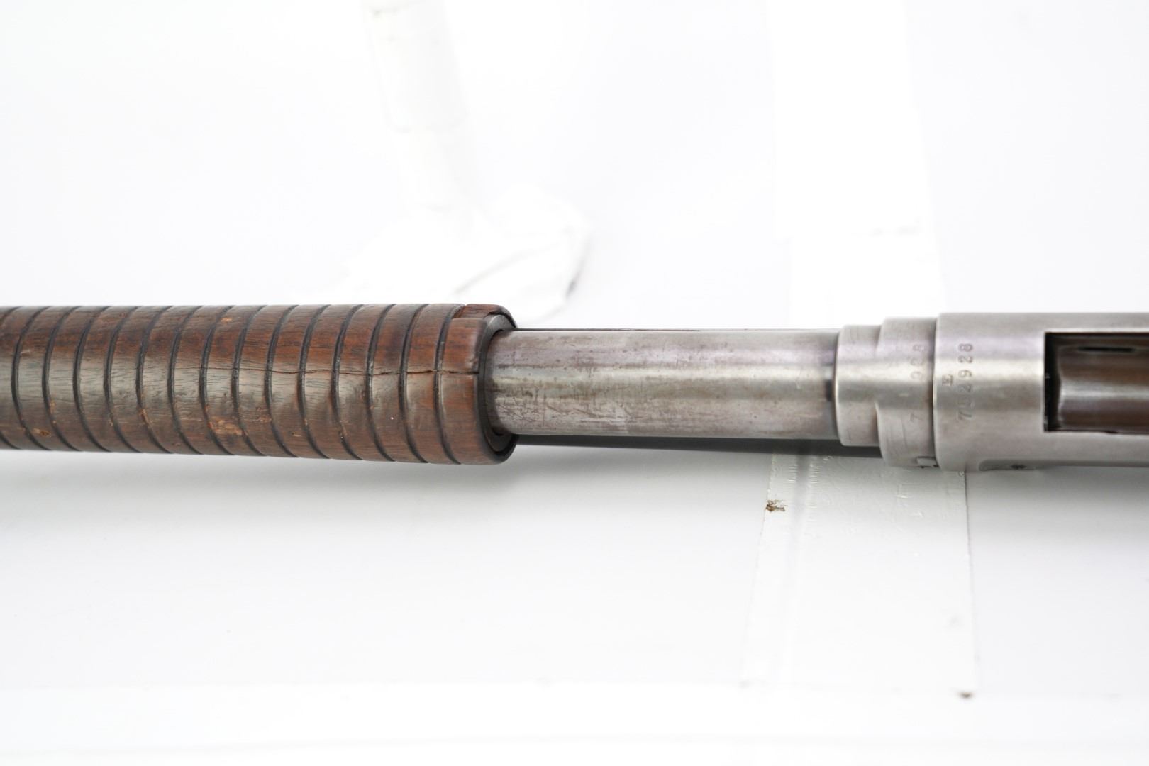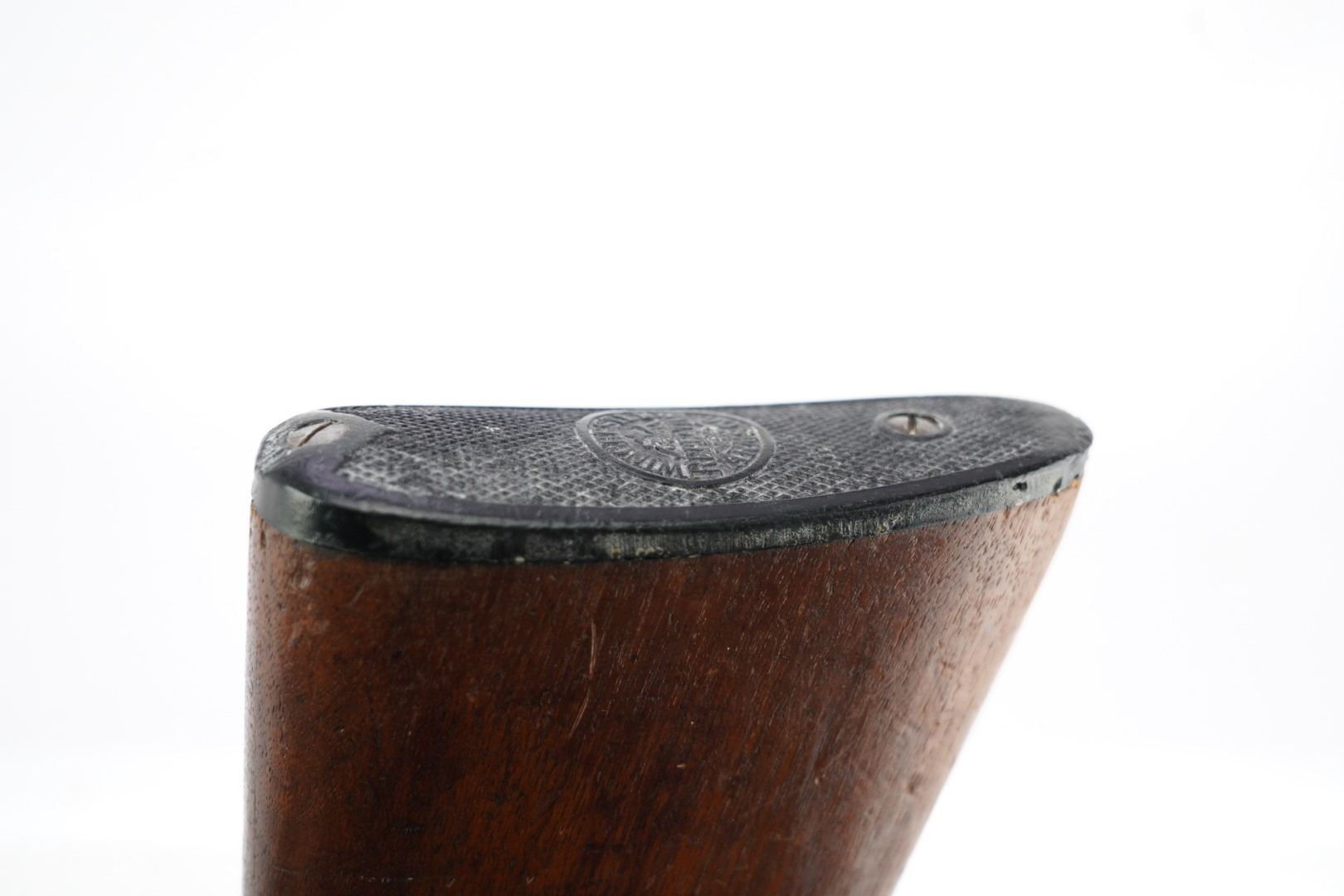 Stock Configuration & Condition: The stocks are two-piece wood featuring a ribbed forend, a semi-pistol grip, a straight comb and a Winchester hard rubber buttplate. The wood shows light to moderate nicks, scratches, dings and some minor handling and storage marks. The forend had scuffing marks, a chip at the left rear and a long crack along the underside from the rear edge going forward. The buttstock has patches of finish loss and speckled chipping along the rear edge. The LOP measures 13 5/8" from the front of the trigger to the back of the buttplate. The buttplate had stuttered impact marks and is slightly proud to the wood on the sides. The stocks are in Good Plus overall condition.