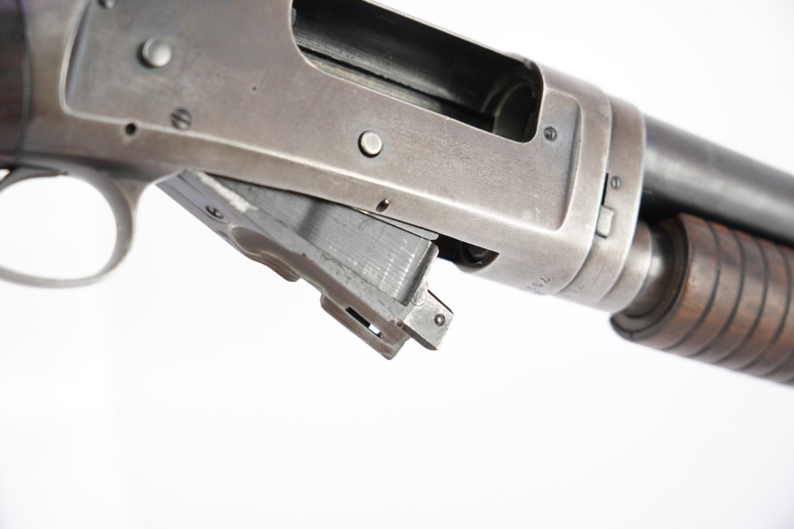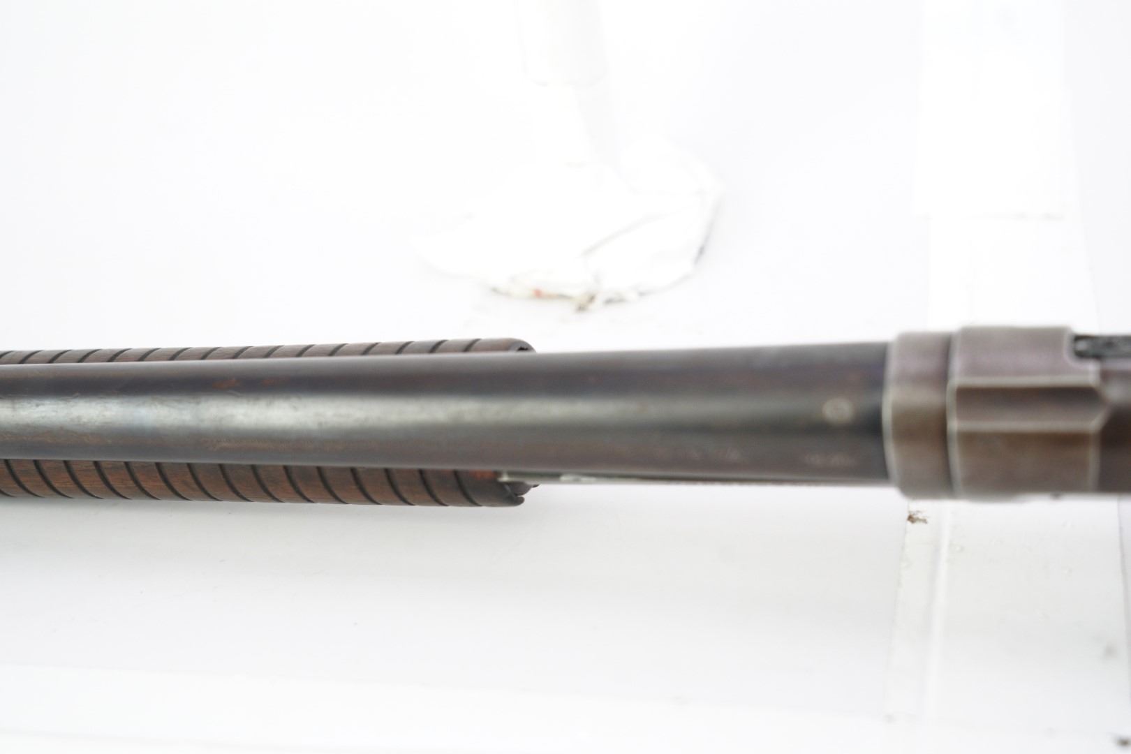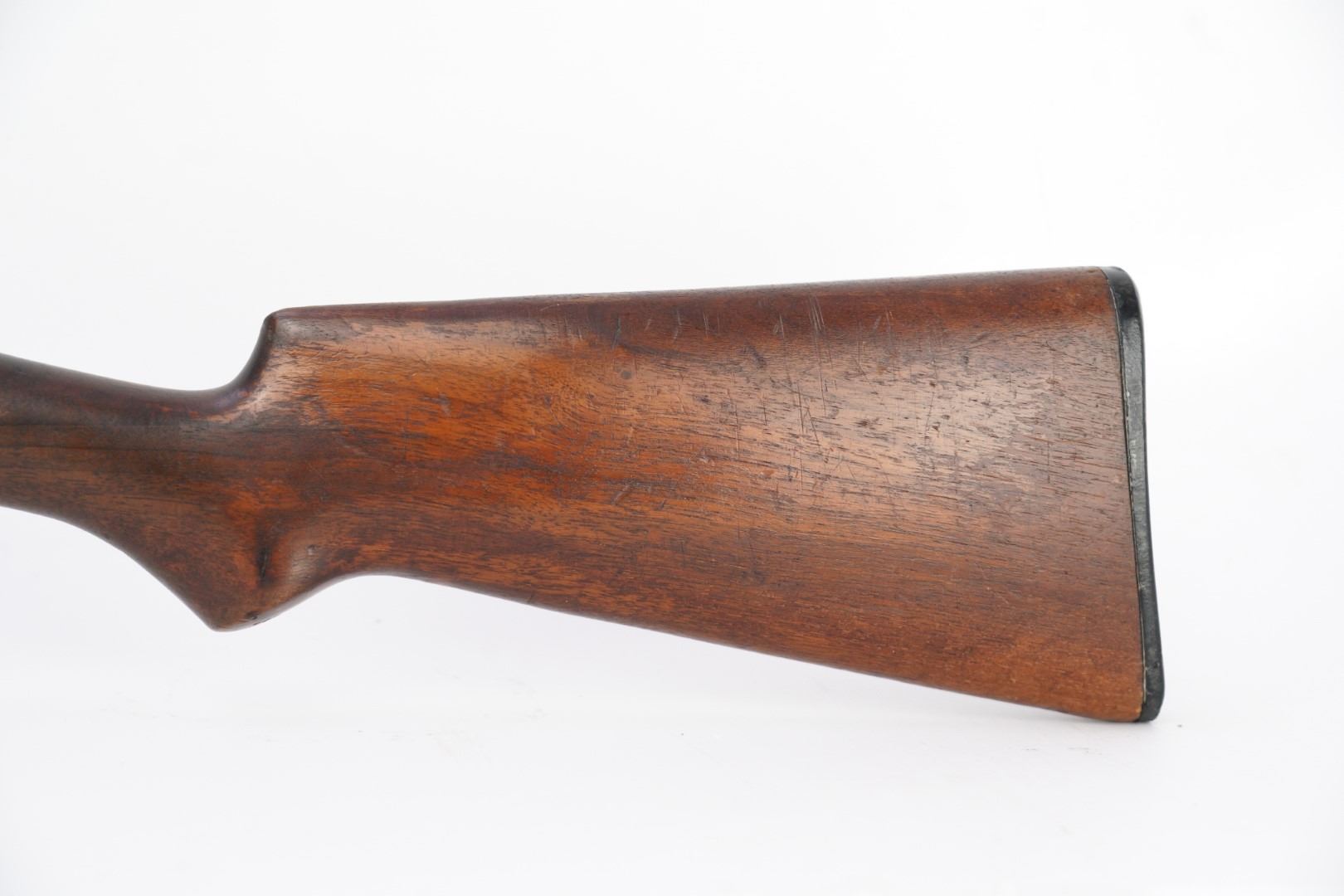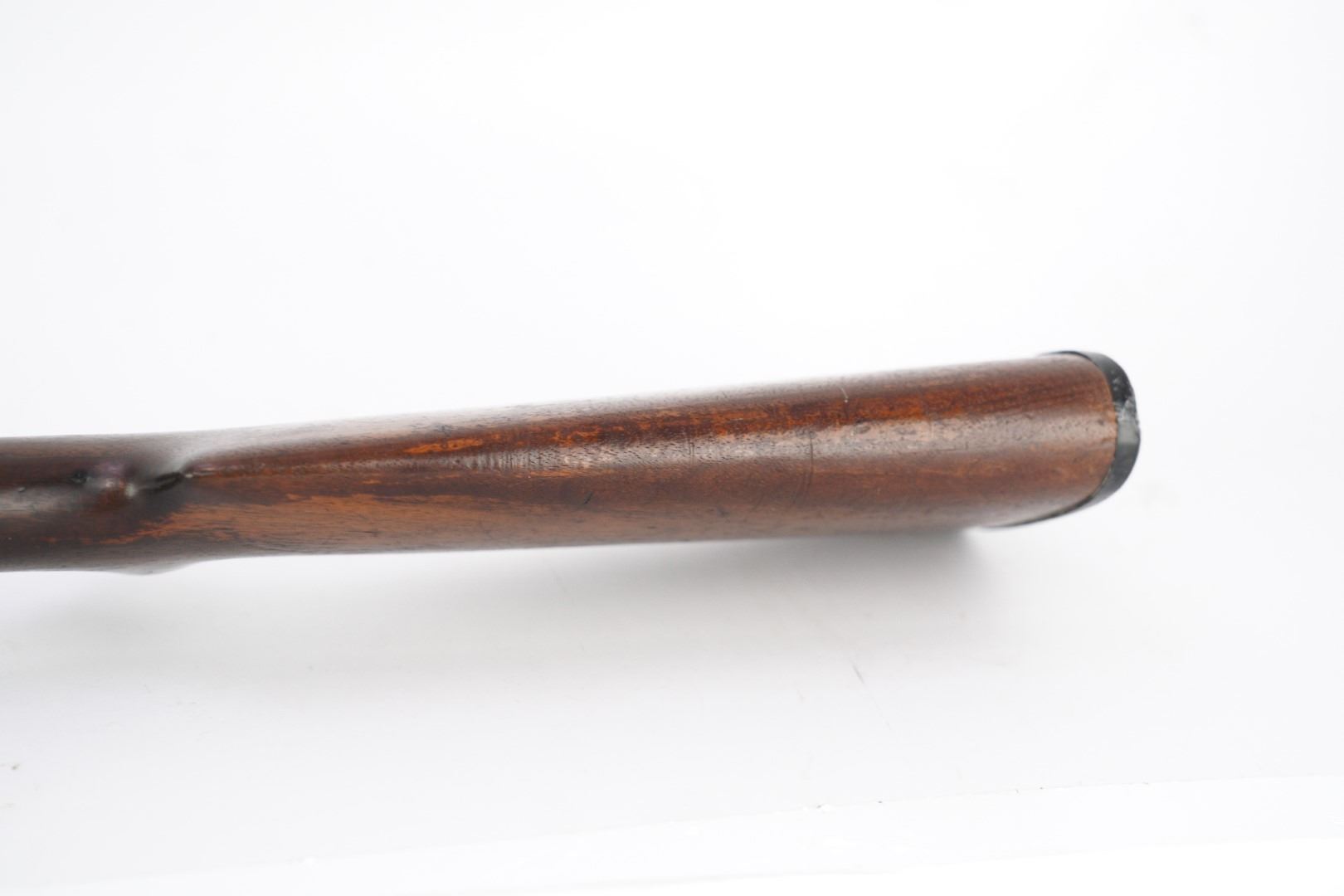 Stock Configuration & Condition: The stocks are two-piece wood featuring a ribbed forend, a semi-pistol grip, a straight comb and a Winchester hard rubber buttplate. The wood shows light to moderate nicks, scratches, dings and some minor handling and storage marks. The forend had scuffing marks, a chip at the left rear and a long crack along the underside from the rear edge going forward. The buttstock has patches of finish loss and speckled chipping along the rear edge. The LOP measures 13 5/8" from the front of the trigger to the back of the buttplate. The buttplate had stuttered impact marks and is slightly proud to the wood on the sides. The stocks are in Good Plus overall condition.