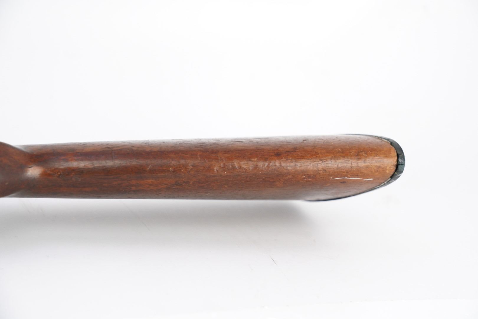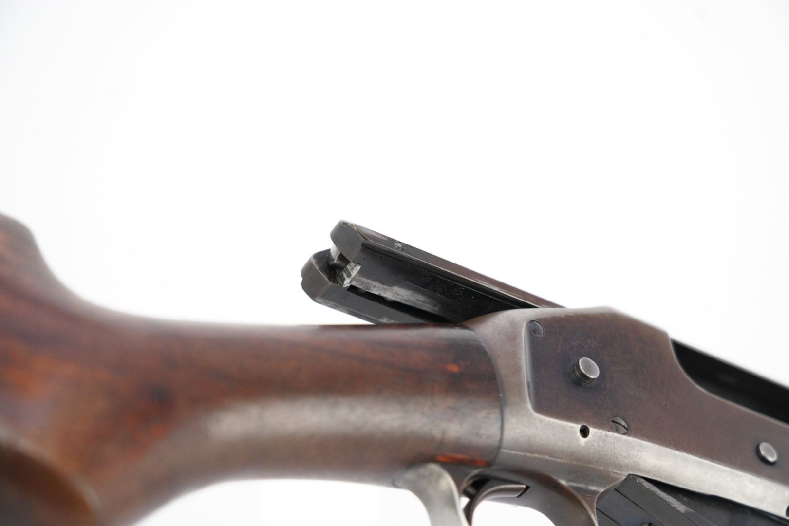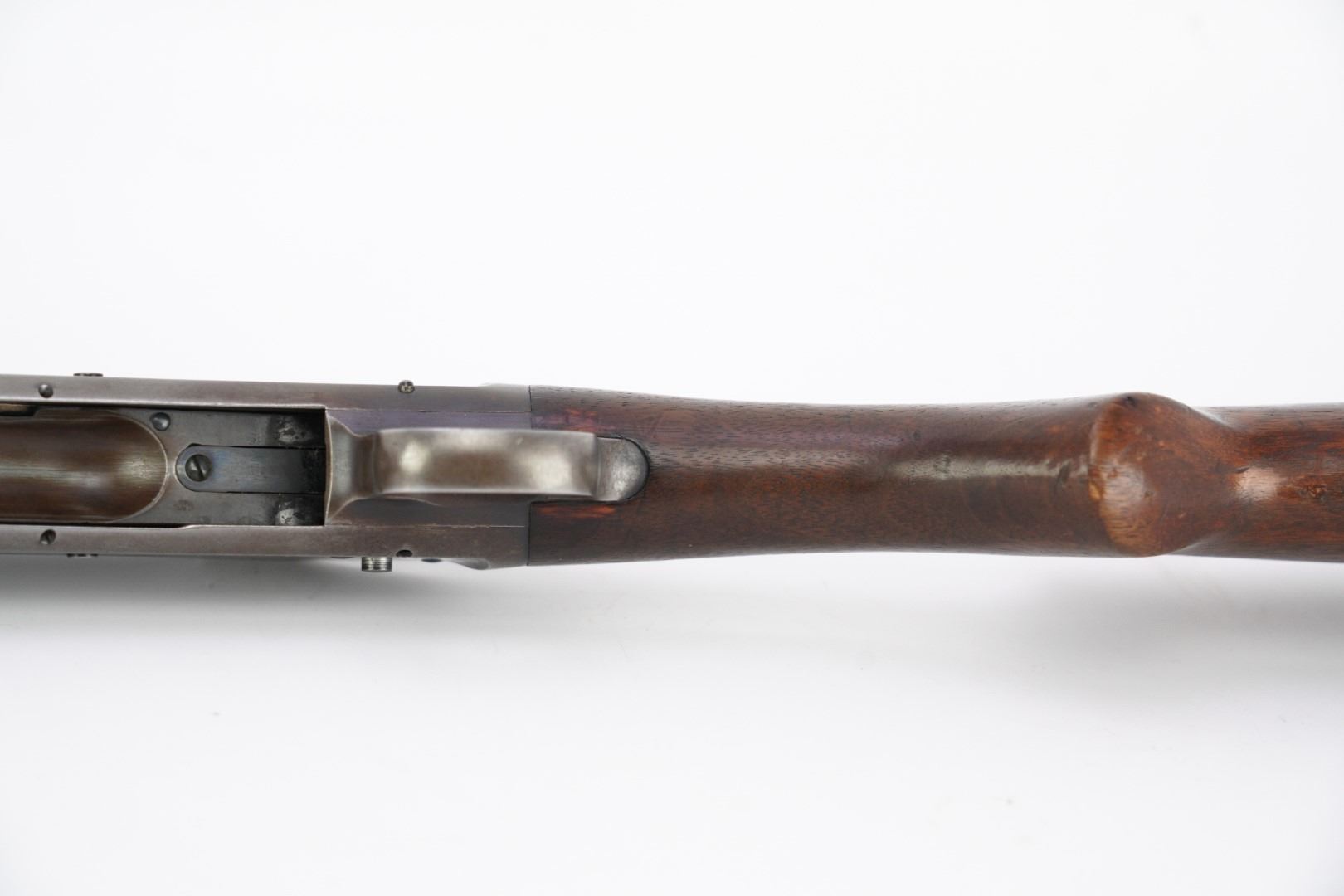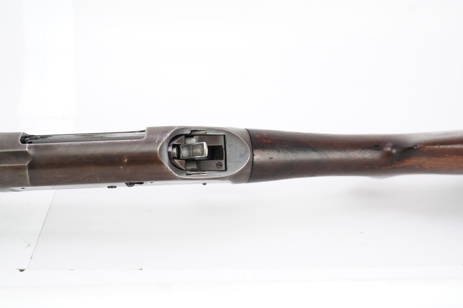 Stock Configuration & Condition: The stocks are two-piece wood featuring a ribbed forend, a semi-pistol grip, a straight comb and a Winchester hard rubber buttplate. The wood shows light to moderate nicks, scratches, dings and some minor handling and storage marks. The forend had scuffing marks, a chip at the left rear and a long crack along the underside from the rear edge going forward. The buttstock has patches of finish loss and speckled chipping along the rear edge. The LOP measures 13 5/8" from the front of the trigger to the back of the buttplate. The buttplate had stuttered impact marks and is slightly proud to the wood on the sides. The stocks are in Good Plus overall condition.