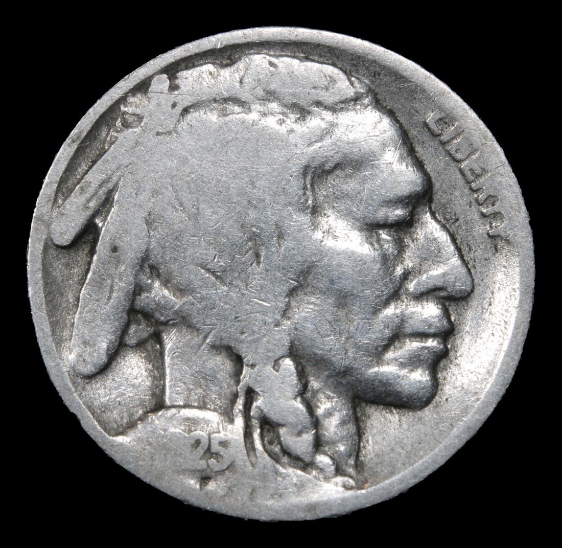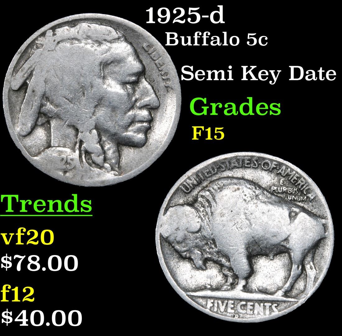 1925-d Semi Key Date . Buffalo Nickel 5c Grades f+. Difficult date. According to David Hall: The 1925-D is very scarce in circulated grades and rare in mint state. In Gem condtition, it is the second rarest Denver Mint Buffalo of the 1920s after the 1927-D. Well struck examples can be found, but softness of strike on the Buffalo's horn and tail can also be seen on a significant number of mint state survivors. Luster is usually pretty good on this issue with a semi-frosty/satiny look.