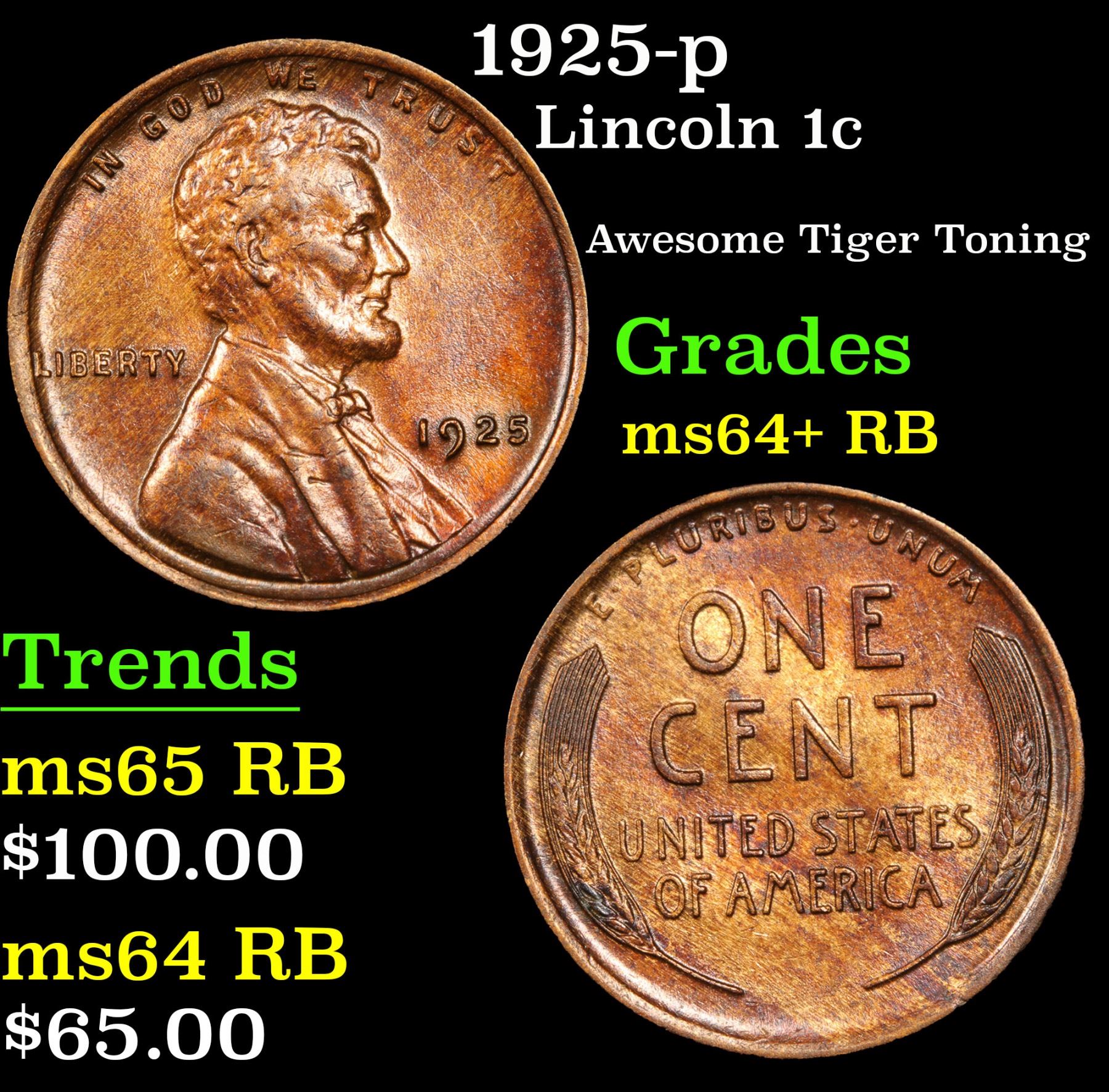1925-p Lincoln Cent 1c Grades Choice+ Unc RB. Awesome Tiger Toning A Corey's Pick