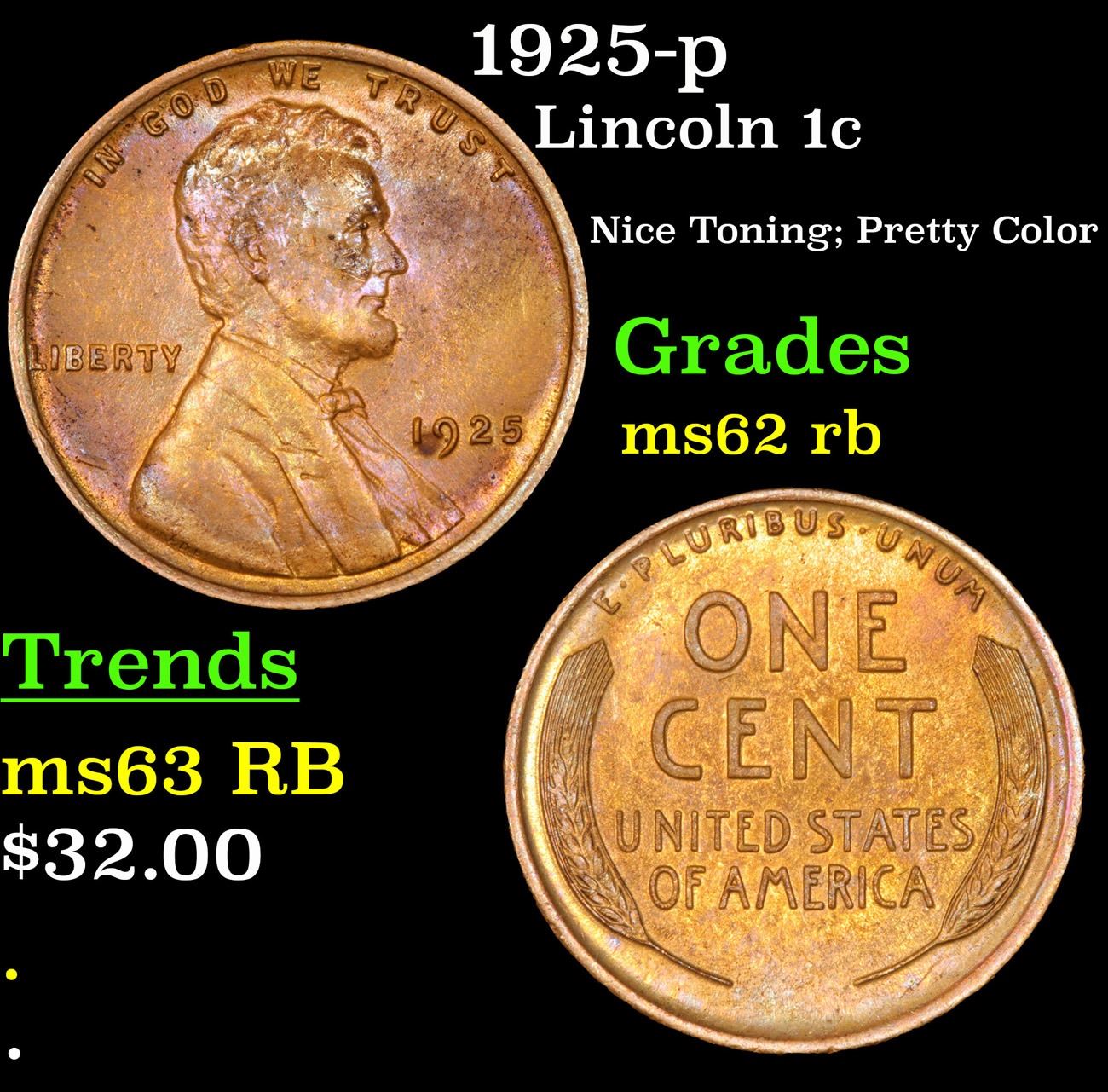 1925-p Nice Toning; Pretty Color . Lincoln Cent 1c Grades Select Unc RB.
