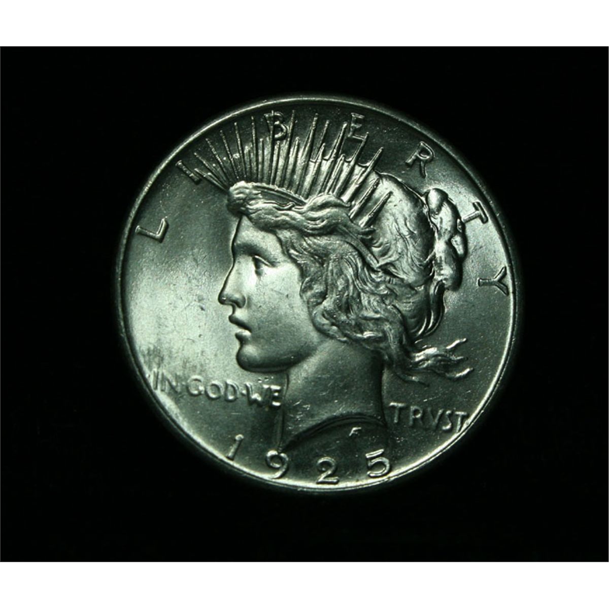A very nice choice Uncirculated Example of the 1925-p Peace Dollar. Great Luster. The Wholesale Greysheet lists ms64 at $87+ Estimated Value $90