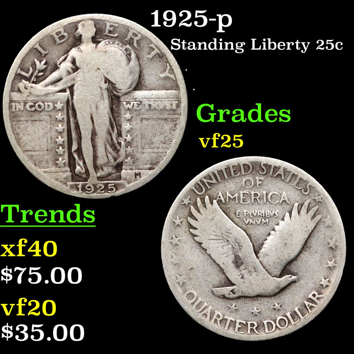1925-p Standing Liberty Quarter 25c Grades vf+.