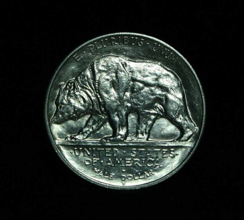 A Blast White and Beautiful Example of a very Difficult and highly sought after Early Commemorative half Dollar. I will offer my personal buy back guarantee, that this coin is all original and will not come back Ungradeable by any major grading service. The high points of the coin are the bear's shoulder and leg and the miner's back, shoulder and shirtsleeve. The coin was a Great success when first issued and is still sought after today. Coin World's Coin Values lists ms64 at $475 and The Wholesale Greysheet lists ms64 at $400. Estimated Value $425