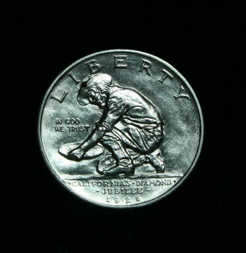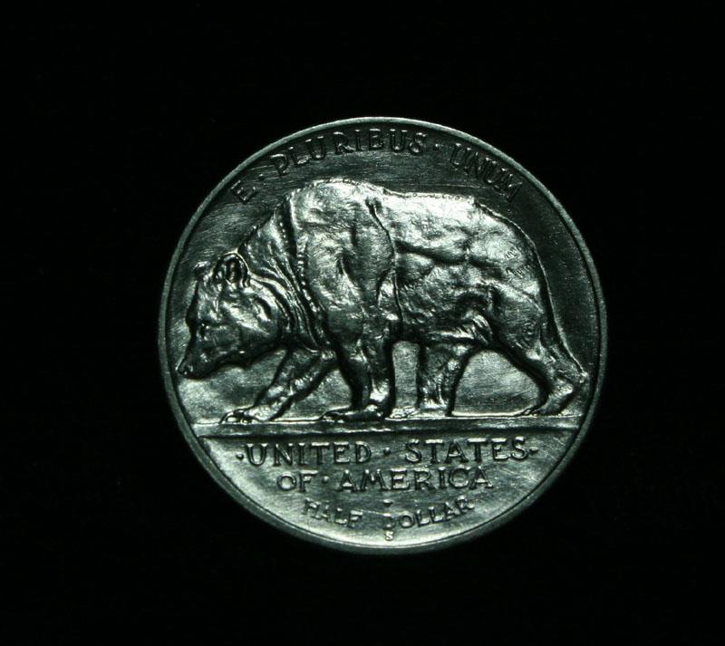 A Blast White and Very nice Example of a Difficult and highly sought after Early Commemorative half Dollar. The high points of the coin are the bear's shoulder and leg and the miner's back, shoulder and shirtsleeve. The coin was a Great success when first issued and is still sought after today. Coin World's Coin Values lists ms64 at $475 and The Wholesale Greysheet lists ms64 at $385. Estimated Value $400