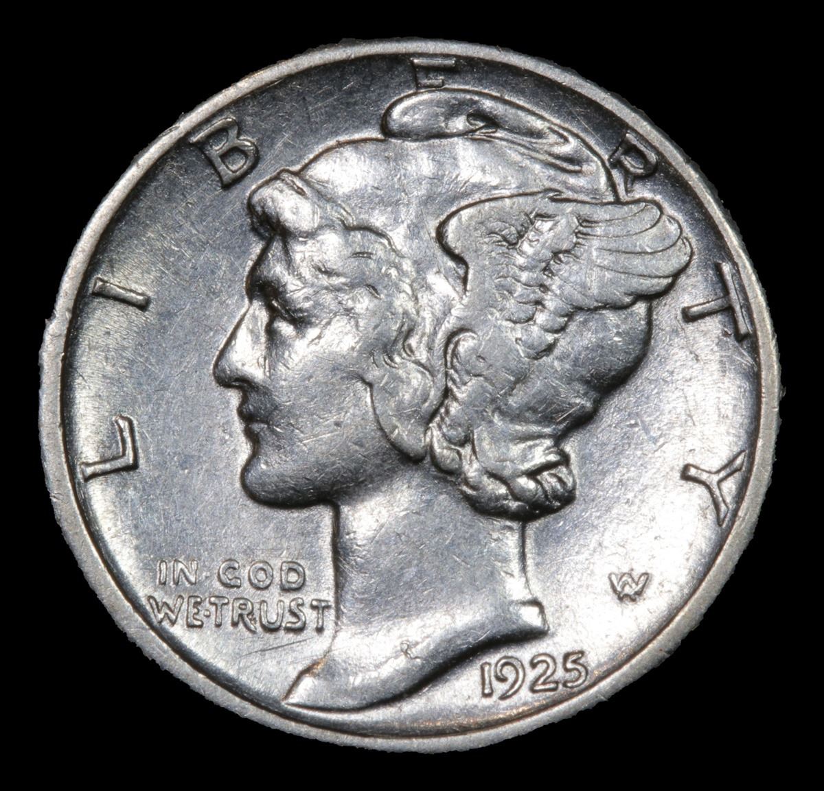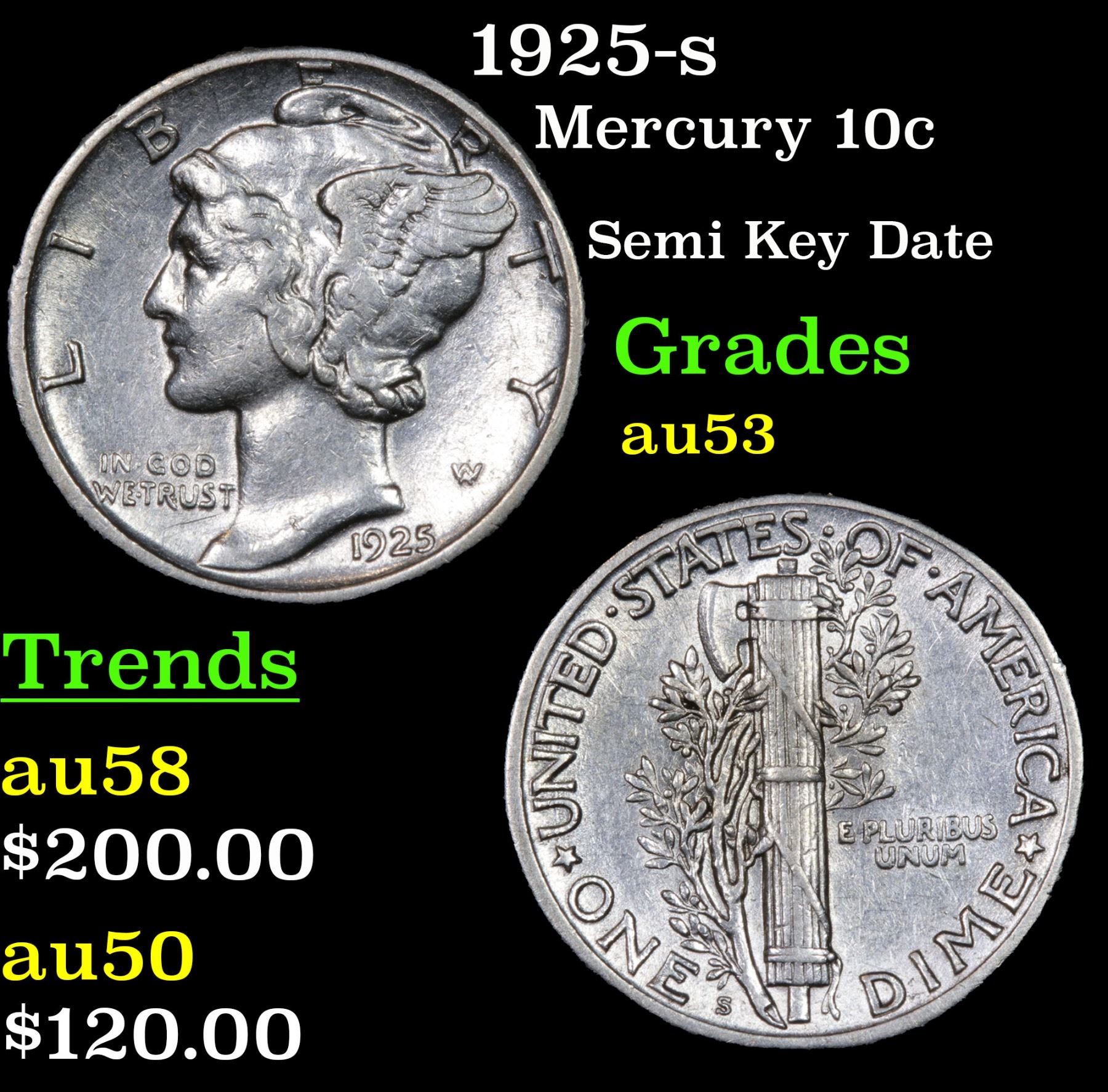1925-s Semi Key Date . Mercury Dime 10c Grades Select AU.