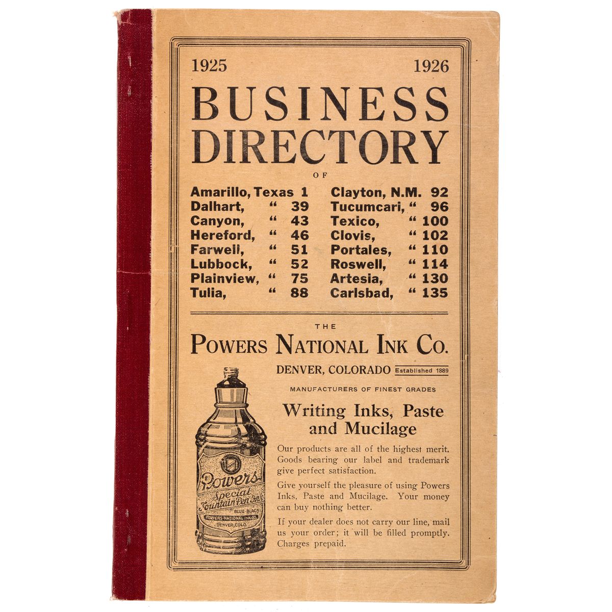 Business Directory covering 88pp. of Texas (from Amarillo to Tulia) and 43pp. of New Mexico from Clayton to Carlsbad. Cover vignette advertisement for Powers National Ink Co. Print is crisp on crème papers in fine condition. Full page vignette on L interior cover of Jonas Bros. Furriers-Taxidermists-Tanners, Denver Colo. At top is a litho print of the factory with flag on roof. 141 pp. 6" x 9". - Vinegar Collection