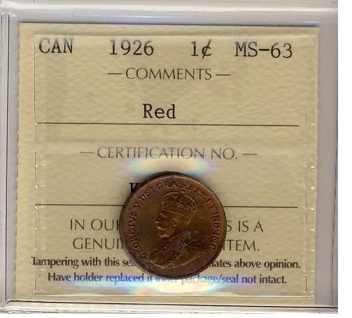 1926 1¢ ICCS MS63RD. A better date for grade.