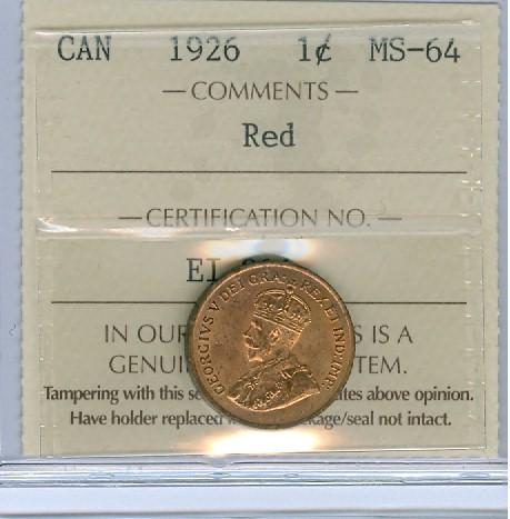 1926 1¢ ICCS MS64RD. 90% red and attractive.