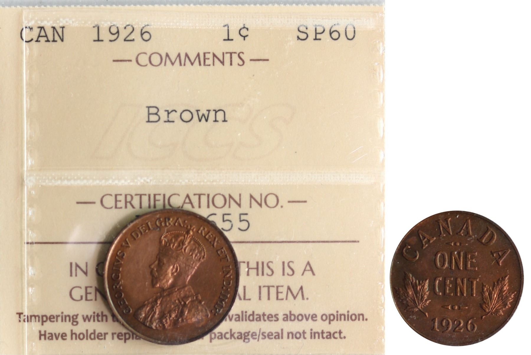 1926 1¢ ICCS SPCIMEN-60 Nice example with clean fields and reflective surfaces.