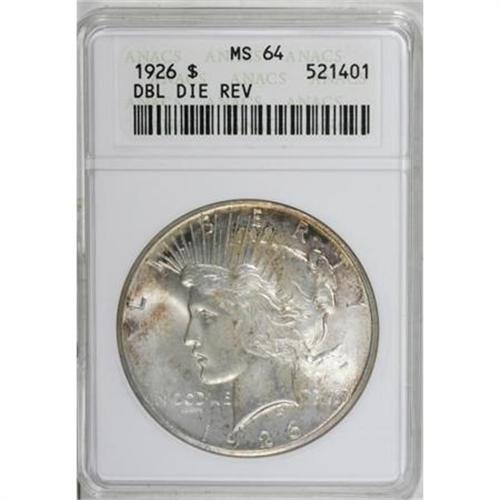 <B>1926 $1 --Double Die Reverse--MS64 ANACS.</B></I> NGC Census: (2400/588). PCGS Population (2682/1191). Mintage: 1,939,000. Numismedia Wsl. Price for NGC/PCGS coin in MS64: $100. (#7367)<BR><BR><B>Coin Engraver:</B> Anthony de Francisci<BR><BR><b>Shipping:</b> Coins & Currency (<a target="_blank" href="http://www.heritageauctions.com/common/shipping.php">view shipping information</a>)