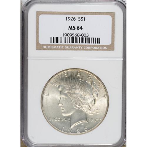 <B>1926 $1 MS64 NGC.</B></I> NGC Census: (2270/565). PCGS Population (2629/1143). Mintage: 1,939,000. Numismedia Wsl. Price: $96. (#7367)<BR><BR><b>Shipping:</b> Coins & Currency (<a target="_blank" href="http://www.heritageauctions.com/common/shipping.php">view shipping information</a>)