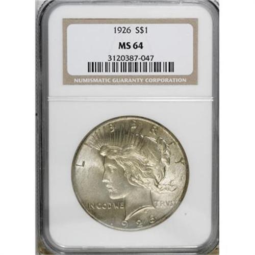 <B>1926 $1 MS64 NGC.</B></I> . NGC Census: (2417/596). PCGS Population (2693/1202). Mintage: 1,939,000. Numismedia Wsl. Price for NGC/PCGS coin in MS64: $94. (#7367)<BR><BR><B>Coin Engraver:</B> Anthony de Francisci<BR><BR><b>Shipping:</b> Coins & Currency (<a target="_blank" href="http://www.heritageauctions.com/common/shipping.php">view shipping information</a>)
