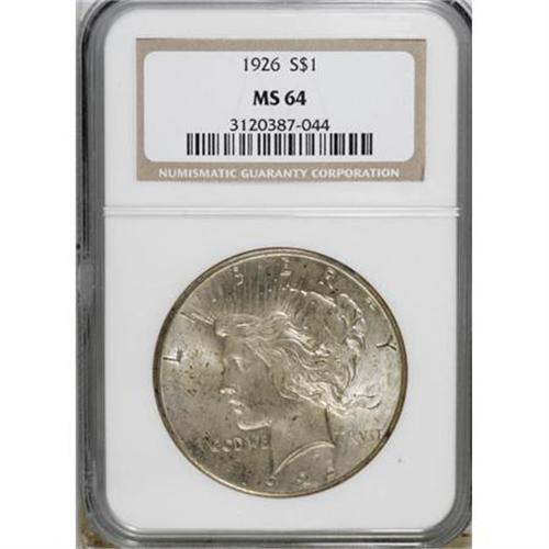 <B>1926 $1 MS64 NGC.</B></I> . NGC Census: (2417/596). PCGS Population (2693/1202). Mintage: 1,939,000. Numismedia Wsl. Price for NGC/PCGS coin in MS64: $94. (#7367)<BR><BR><B>Coin Engraver:</B> Anthony de Francisci<BR><BR><b>Shipping:</b> Coins & Currency (<a target="_blank" href="http://www.heritageauctions.com/common/shipping.php">view shipping information</a>)