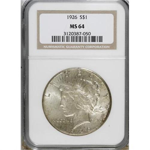 <B>1926 $1 MS64 NGC.</B></I> . NGC Census: (2417/596). PCGS Population (2693/1202). Mintage: 1,939,000. Numismedia Wsl. Price for NGC/PCGS coin in MS64: $94. (#7367)<BR><BR><B>Coin Engraver:</B> Anthony de Francisci<BR><BR><b>Shipping:</b> Coins & Currency (<a target="_blank" href="http://www.heritageauctions.com/common/shipping.php">view shipping information</a>)