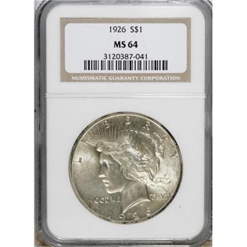 <B>1926 $1 MS64 NGC.</B></I> . NGC Census: (2417/596). PCGS Population (2693/1202). Mintage: 1,939,000. Numismedia Wsl. Price for NGC/PCGS coin in MS64: $94. (#7367)<BR><BR><B>Coin Engraver:</B> Anthony de Francisci<BR><BR><b>Shipping:</b> Coins & Currency (<a target="_blank" href="http://www.heritageauctions.com/common/shipping.php">view shipping information</a>)