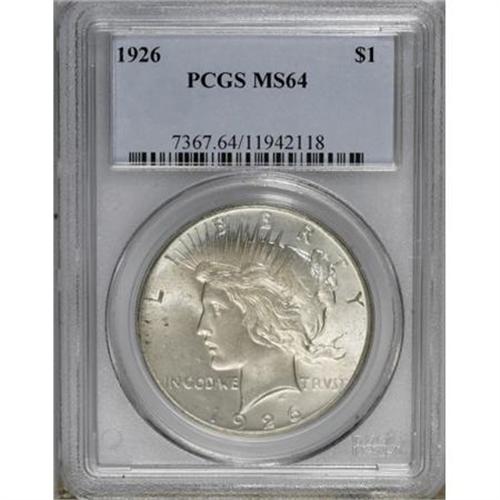 <B>1926 $1 MS64 PCGS.</B></I> . PCGS Population (2700/1210). NGC Census: (2416/596). Mintage: 1,939,000. Numismedia Wsl. Price for NGC/PCGS coin in MS64: $95. (#7367)<BR><BR><B>Coin Engraver:</B> Anthony de Francisci<BR><BR><b>Shipping:</b> Coins & Currency (<a target="_blank" href="http://www.heritageauctions.com/common/shipping.php">view shipping information</a>)