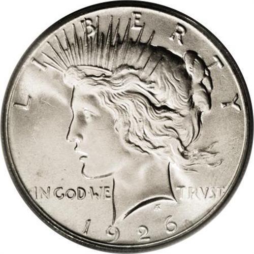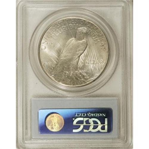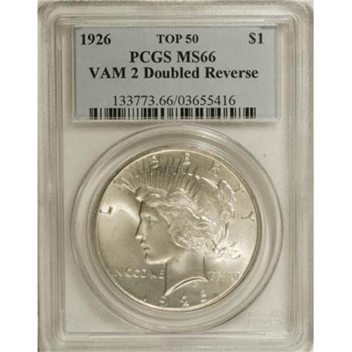 <B>1926 $1 VAM-2, Doubled Reverse, Top 50 Variety, MS66 PCGS.</B></I> Attributed by doubling on the olive leaves and stems, the eagle's back leg feathers, and the internal rays. The <I>Official Guide to the Top 50 Peace Dollar Varieties</B></I> (2002) states that "... this variety is not a major rarity. However, of the two hundred or so Peace dollar die varieties now cataloged by Van Allen/Mallis, only a handful can compare with the strength of the doubling on this reverse. Indeed, what the VAM 2 lacks in terms of rarity, it more than makes up in desirability." Bright luster adorns well preserved surfaces on this Premium Gem specimen. Hints of incipient gold color adhere to both sides, and a well executed strike emboldens the design elements.<BR><BR><b>Shipping:</b> Coins & Currency (<a target="_blank" href="http://www.heritageauctions.com/common/shipping.php">view shipping information</a>)