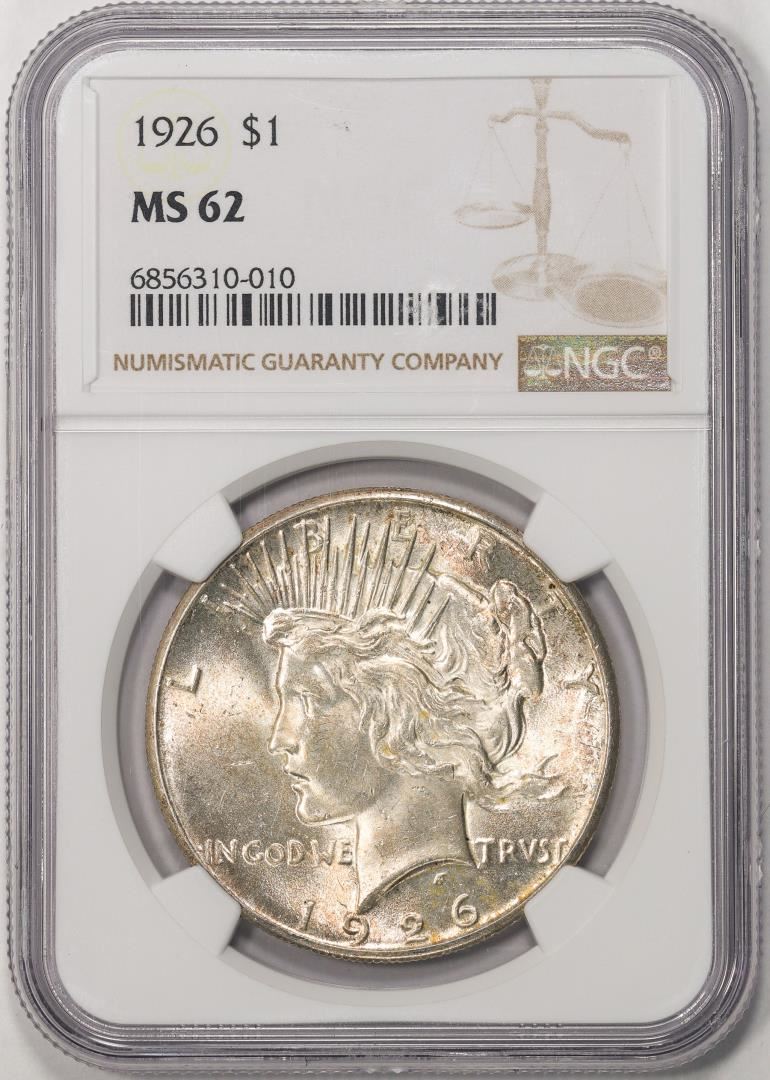 One 1926 $1 Peace Silver Dollar Coin NGC MS62. NGC Certified.