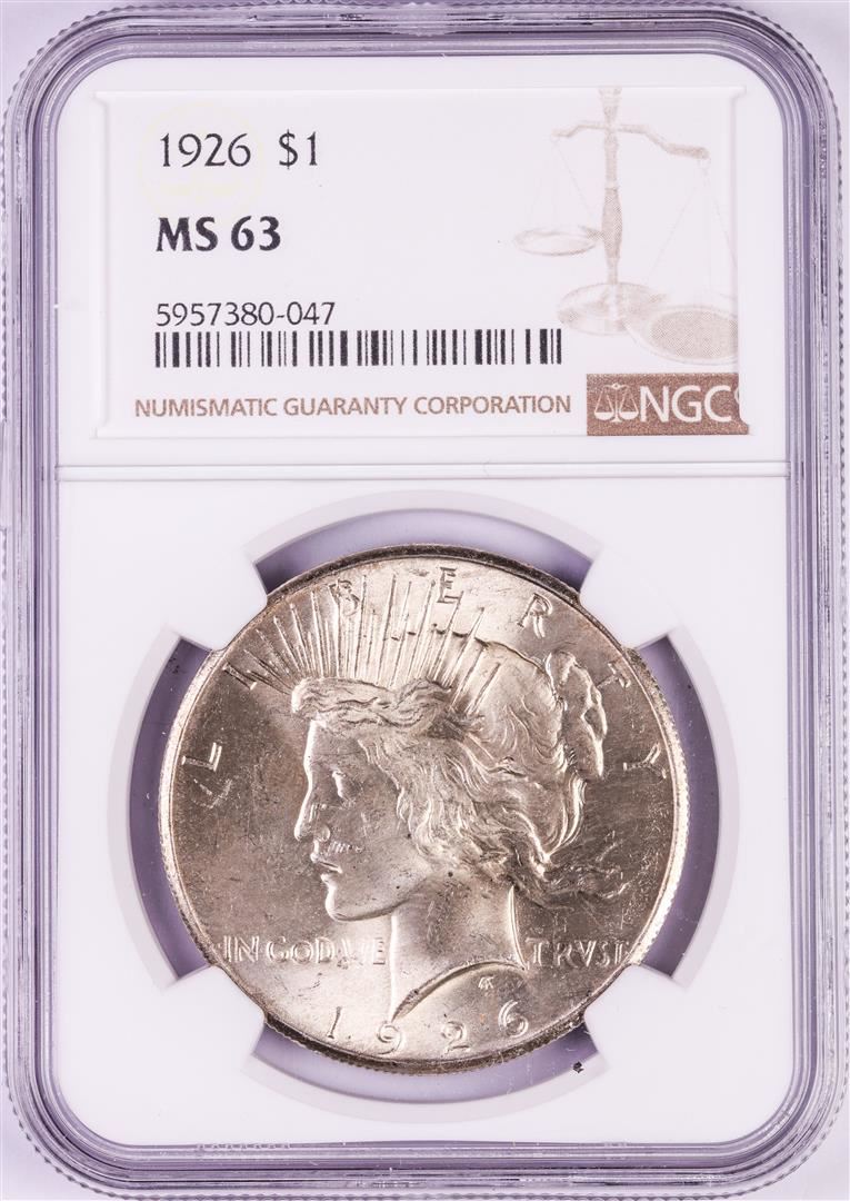 One 1926 $1 Peace Silver Dollar Coin NGC MS63. NGC Certified.