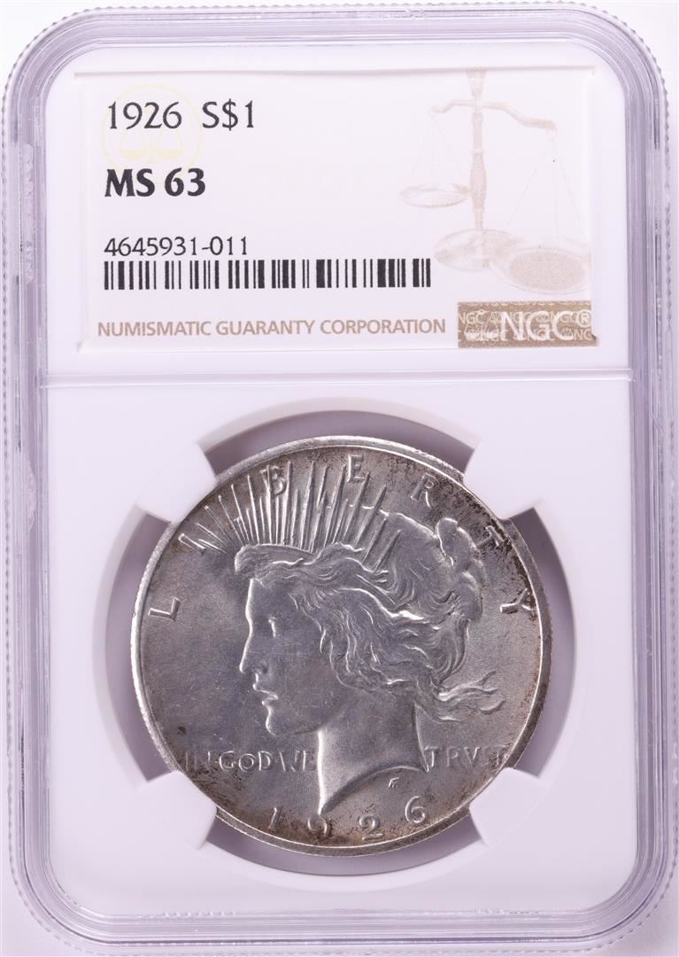 One 1926 $1 Peace Silver Dollar Coin NGC MS63. NGC Certified.