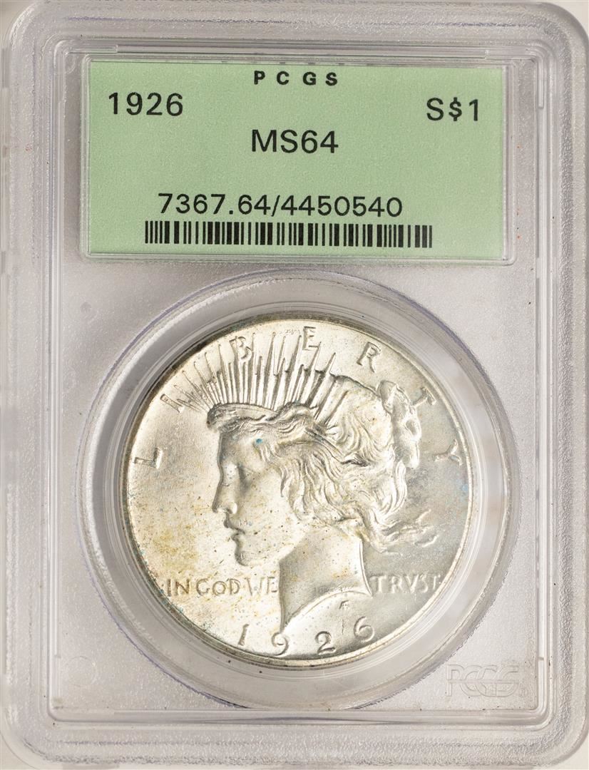 One 1926 $1 Peace Silver Dollar Coin PCGS MS64 Old Green Holder. PCGS Graded.