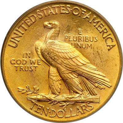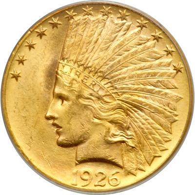1926 $10 Indian. PCGS graded MS-62. Golden toning is evident on both sides. An attractive Indian $10 (PCGS # 8882) .