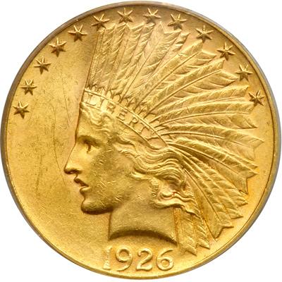 1926 $10 Indian. PCGS graded MS-62. Lightly toned. We note a moderate obverse scuff in the headdress around 3:00 (PCGS # 8882) .