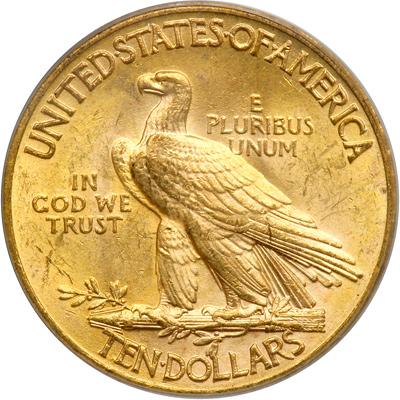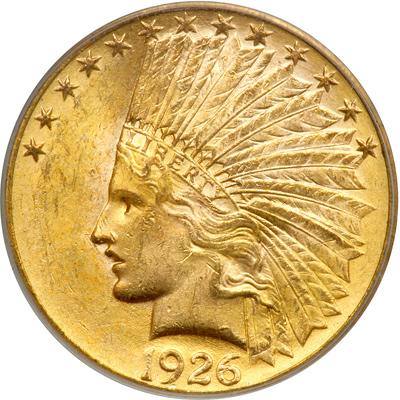 1926 $10 Indian. PCGS graded MS-63. Attractive sunset golden tones. Covered in luster the way of most 1926 Eagles (PCGS # 8882) .