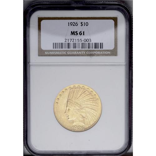 <B>1926<$10> MS61 NGC.</B></I> Vibrant luster and subtle patina with minor scuffiness on each side that prevents a higher grade assessment. Nice eye appeal for an MS61 representative of this common date.
