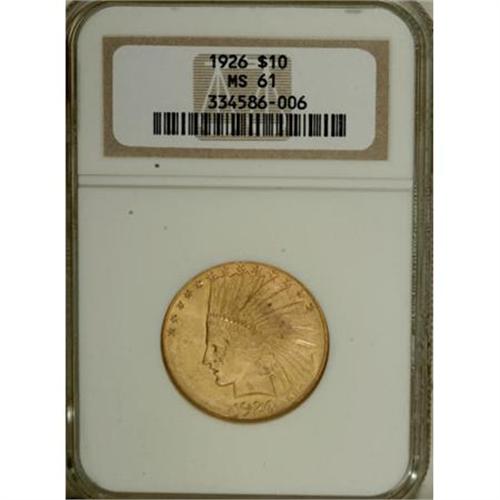 <B>1926 $10 MS61 NGC.</B></I> NGC Census: (2781/19099). PCGS Population (2393/17635). Mintage: 1,014,000. Numismedia Wsl. Price for NGC/PCGS coin in MS61: $700. (#8882)<BR><BR><B>Coin Engraver:</B> Augustus Saint-Gaudens<BR><BR><b>Shipping:</b> Coins & Currency (<a target="_blank" href="http://www.heritageauctions.com/common/shipping.php">view shipping information</a>)